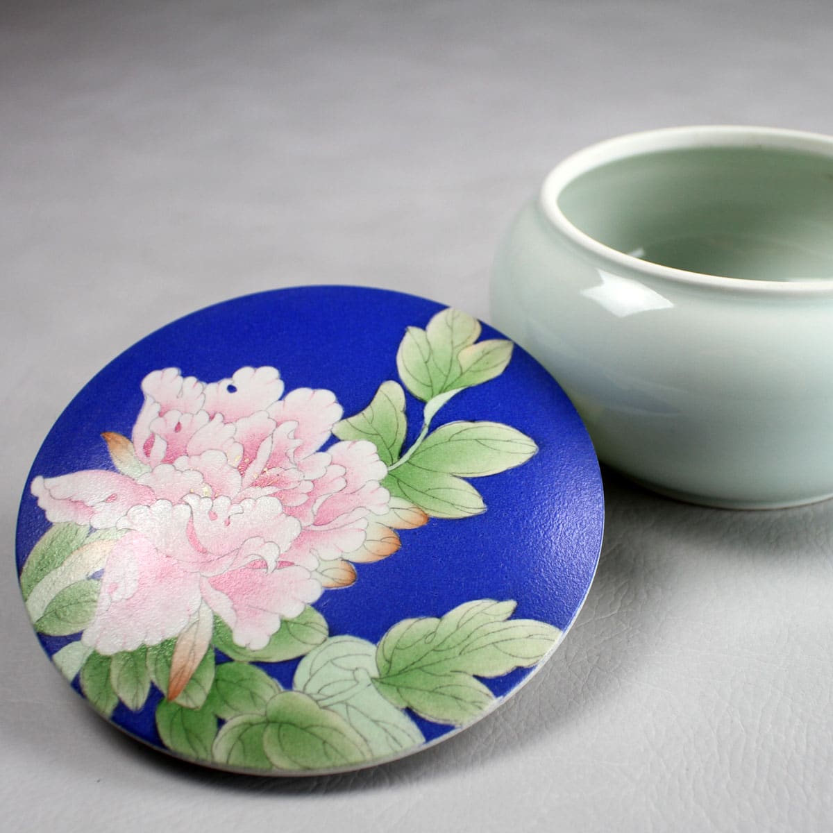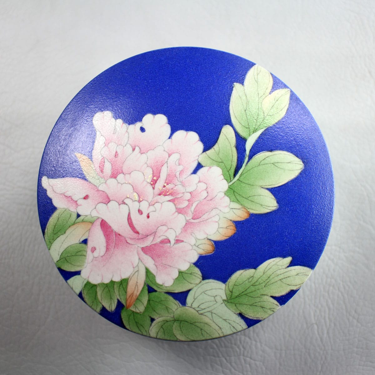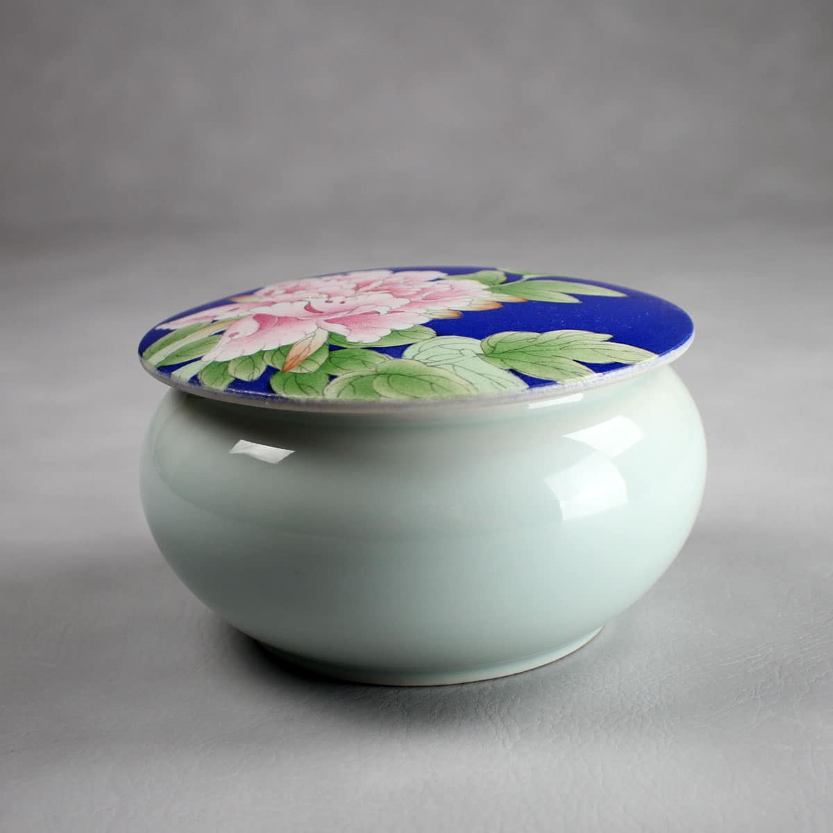 Das Motiv auf dem Deckel der qualitativ hochwertigen Porzellandose ist eine prachtvoll blühende Pfingstrose. In China ist sie Symbol für Glück und Wohlstand.