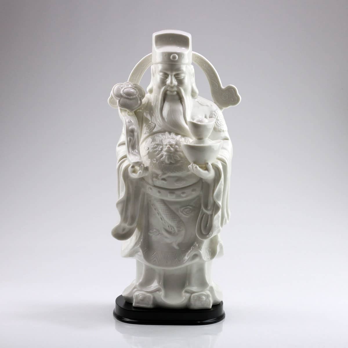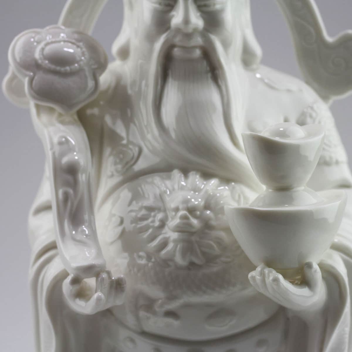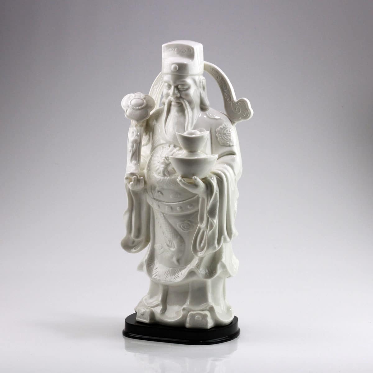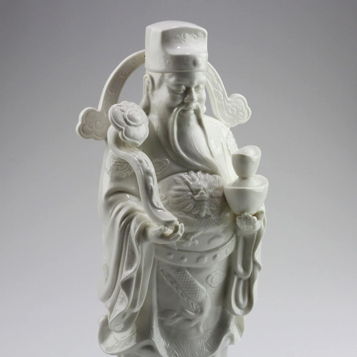 Diese Porzellan-Figur zeigt „Lu“, den Gott des Ansehens, des Reichtums und der Fröhlichkeit in einem prachtvollen Gewand geziert mit einem chinesischen Drachen, Glückssymbolen und Wolkenornamenten. Seine Kopfbedeckung gleicht die eines Mandarin. In seiner linken Hand hält er ein Goldschiffchen, einen Barren, in der rechten das Ruyi-Zepter als stilisierten Lotus, einen traditionellen, chinesischen Talisman. Die weisse Porzellanskulptur ist auf einem festen, dunklen Sockel befestigt (schöner Kontrast).