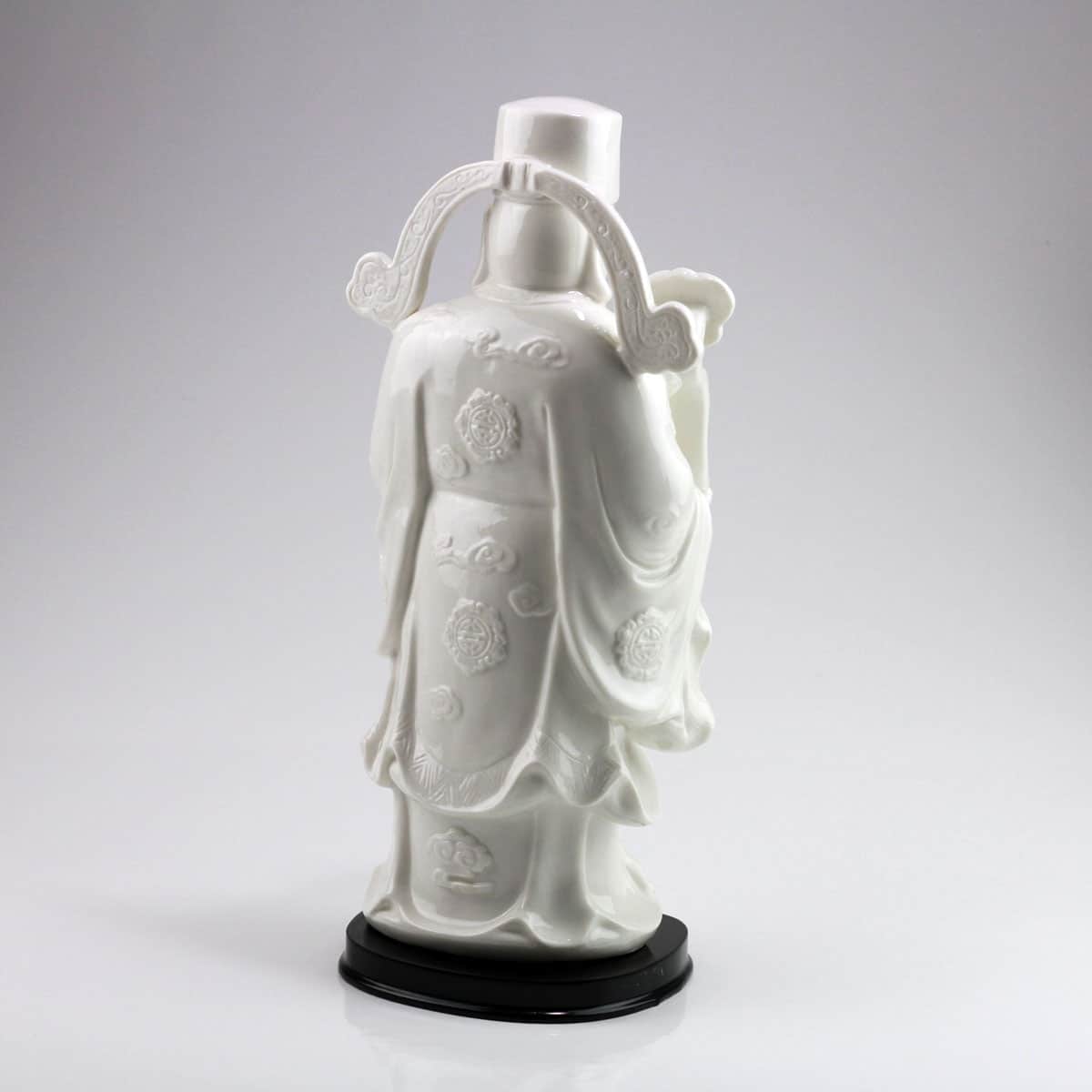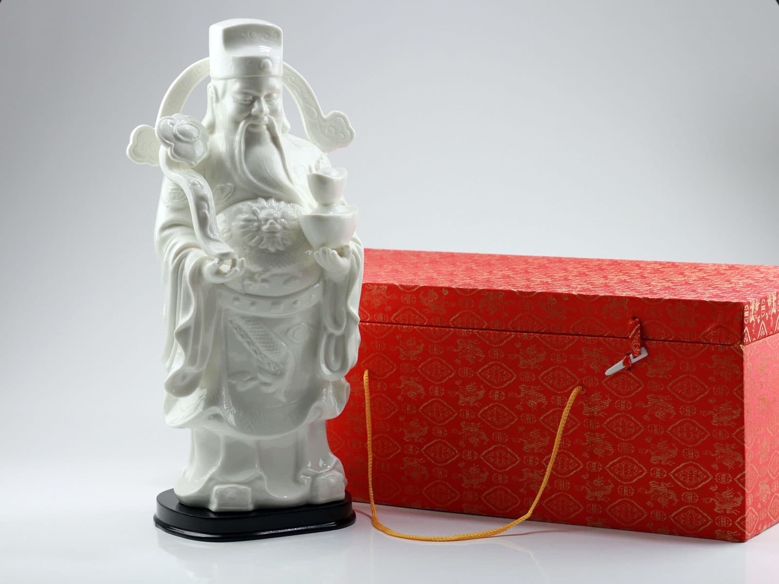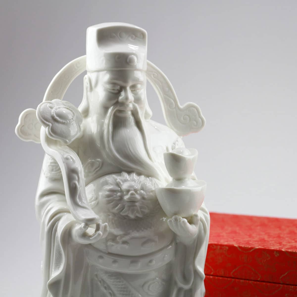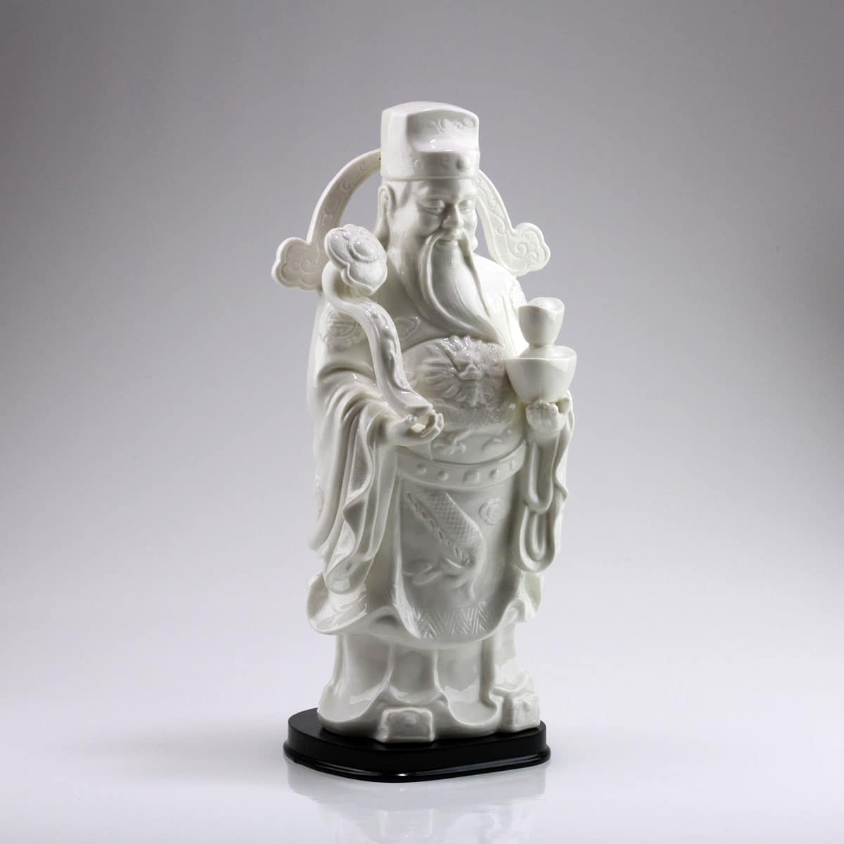 Diese Porzellan-Figur zeigt „Lu“, den Gott des Ansehens, des Reichtums und der Fröhlichkeit in einem prachtvollen Gewand geziert mit einem chinesischen Drachen, Glückssymbolen und Wolkenornamenten. Seine Kopfbedeckung gleicht die eines Mandarin. In seiner linken Hand hält er ein Goldschiffchen, einen Barren, in der rechten das Ruyi-Zepter als stilisierten Lotus, einen traditionellen, chinesischen Talisman. Die weisse Porzellanskulptur ist auf einem festen, dunklen Sockel befestigt (schöner Kontrast).
