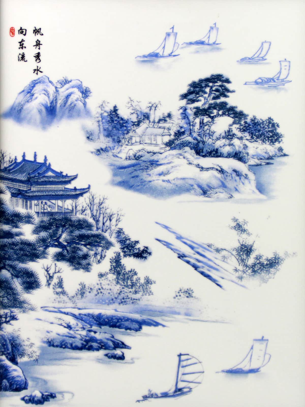 Klassisches, chinesisches Porzellan-Wandbild, eingefaßt in einen Bilderrahmen mit Aufhängevorrichtung rückseitig, als kunstvolle Wanddekoration. Das harmonische und detailreiche Motiv eines Mönchstempels auf einem Hügel, auf einem Hang entstandenes kleines Dorf und die traditionell chinesischen Segelboote (Dschunken), umgeben von einer idyllischen chinesischen Landschaft, ist stilvoll und lädt zum Verweilen ein. Die chinesischen Schriftzeichen bedeuten in etwa „Segelboote und schönes Wasser fließen nach Osten“.