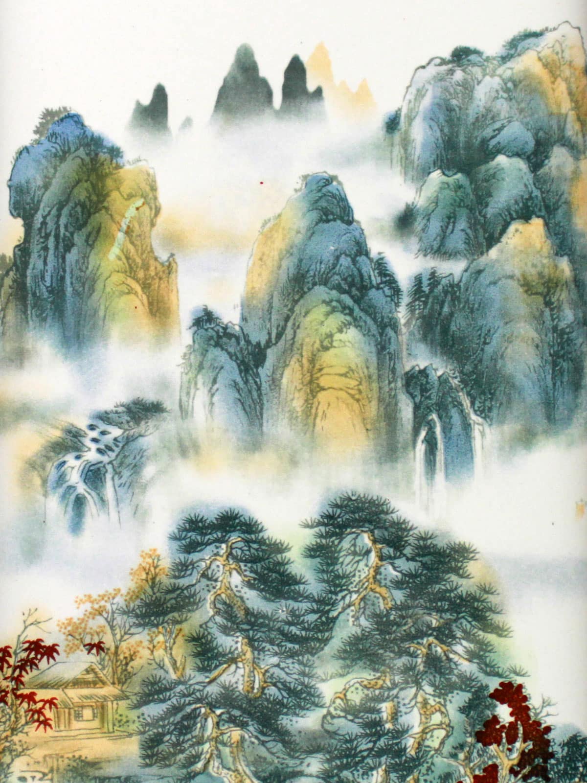 Das Motiv einer malerischen Wasser-und Gebirgslandschaft, scheinbar von Guilin, ist ein von chinesischen Künstlern und Dichtern sehr beliebtes und bekanntes. Kegelförmige, grüne Berge, bizarre Felsen und Steinhöhlen, glasklare Gewässer zeichnen die Karst-Landschaft von Guilin an den Ufern des Flusses Li.