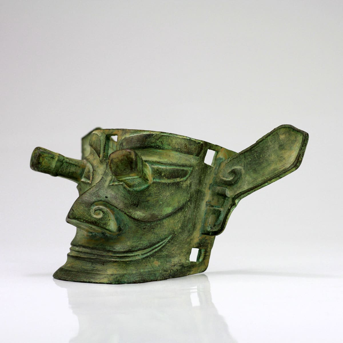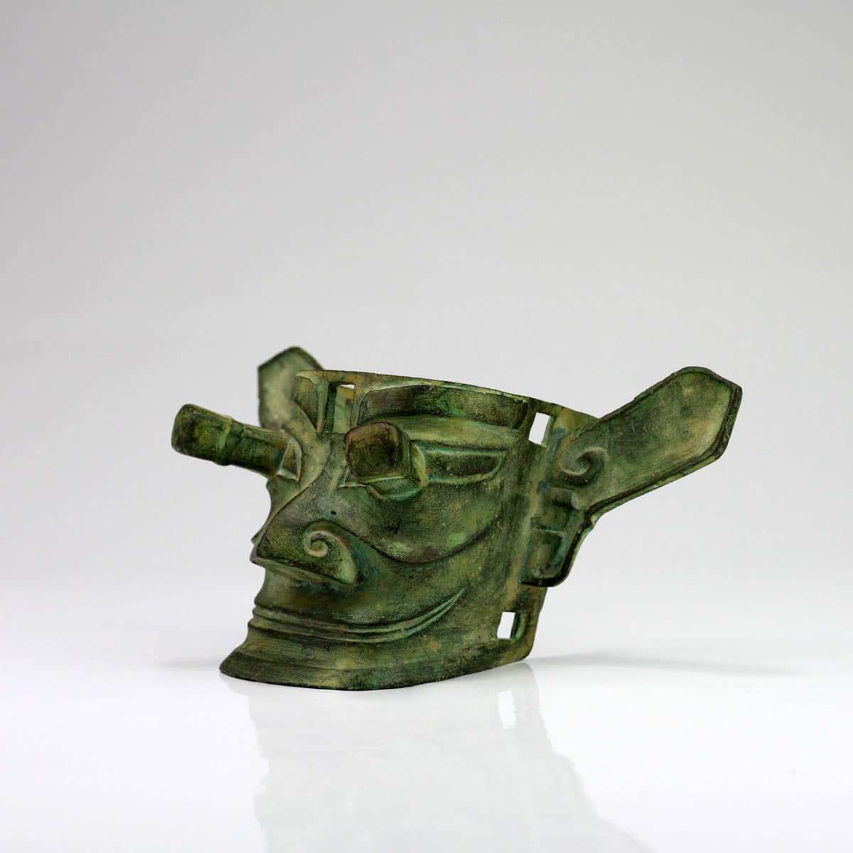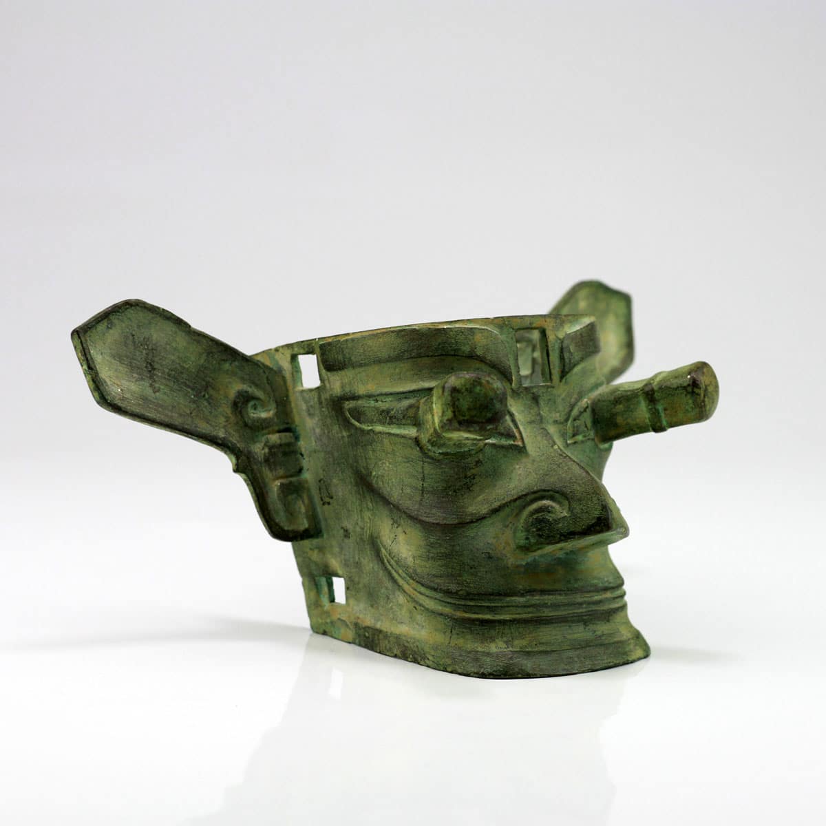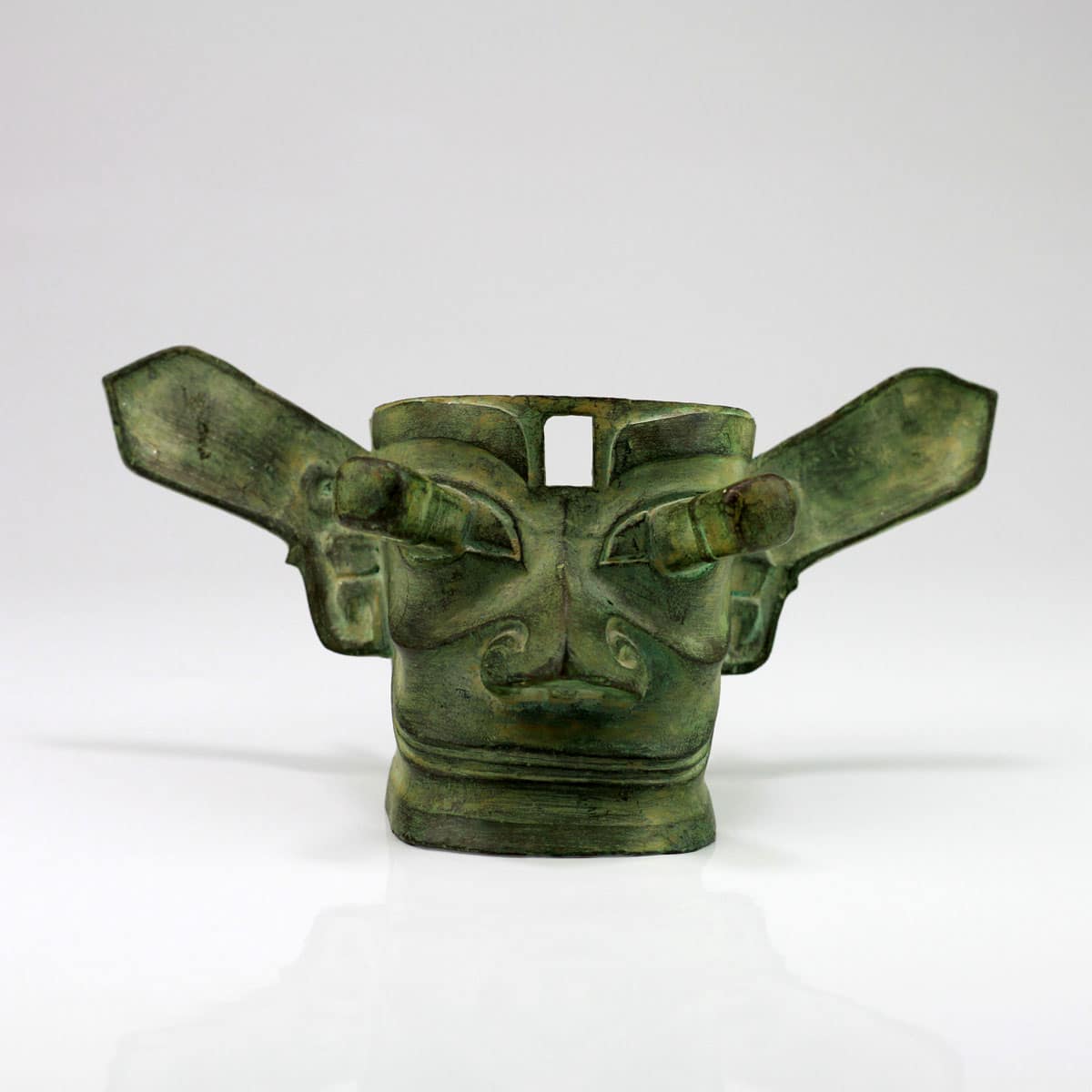 Eine geheimnisvolle Bronzemaske mit auffallend großen Ohren und hervortretenden Pupillen, faszinierend und unheimlich zugleich. Es handelt sich bei dieser Bronzefigur um eine Replik, von einer im Jahre 1929 gefundenen Bronzemasken in Sanxingdui.