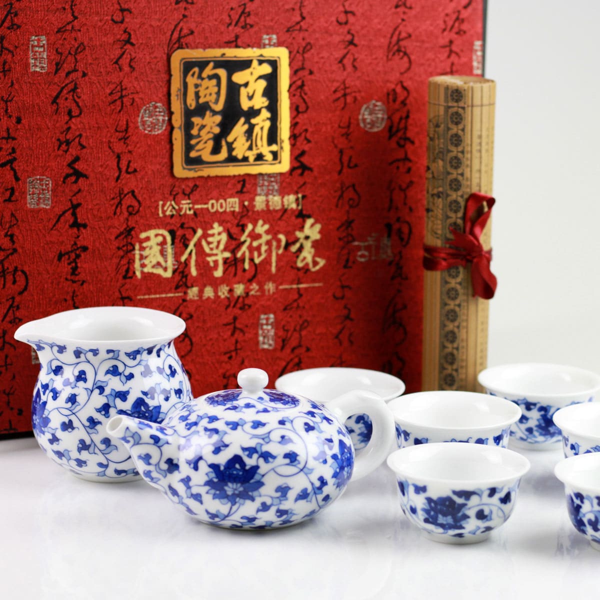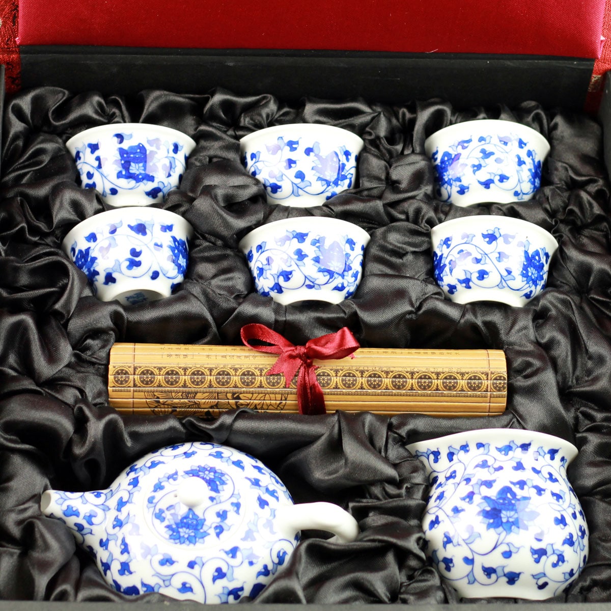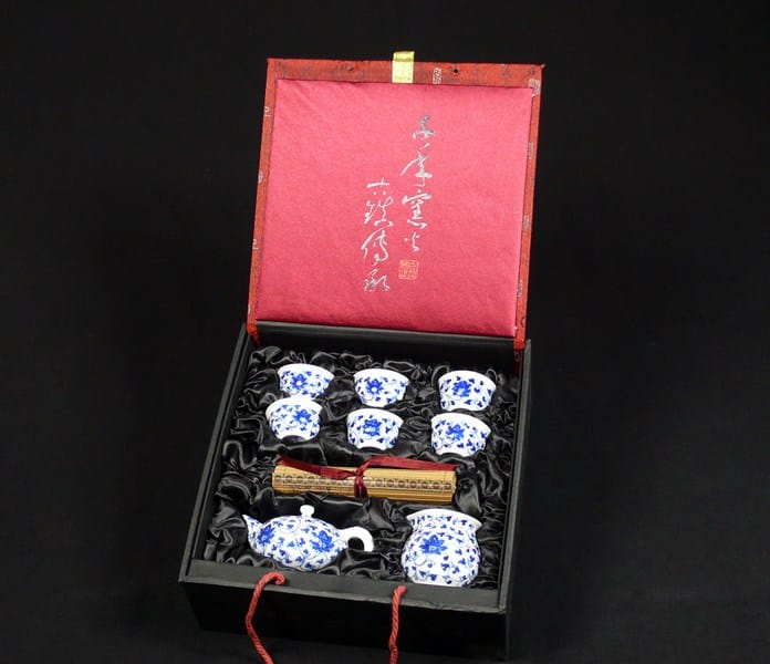 Dieses einzigartige 8-teilige Teeservice, das zusätzlich einen traditionellen Unterleger enthält, senden wir Ihnen in einer dekorativen, sehr stilvollen Box, die mit feinem Stoff überzogen ist. Das Motiv der Lotusblume bringt noch mehr Ruhe in Ihre persönliche Teestunde.
