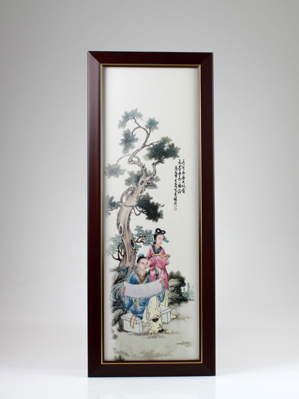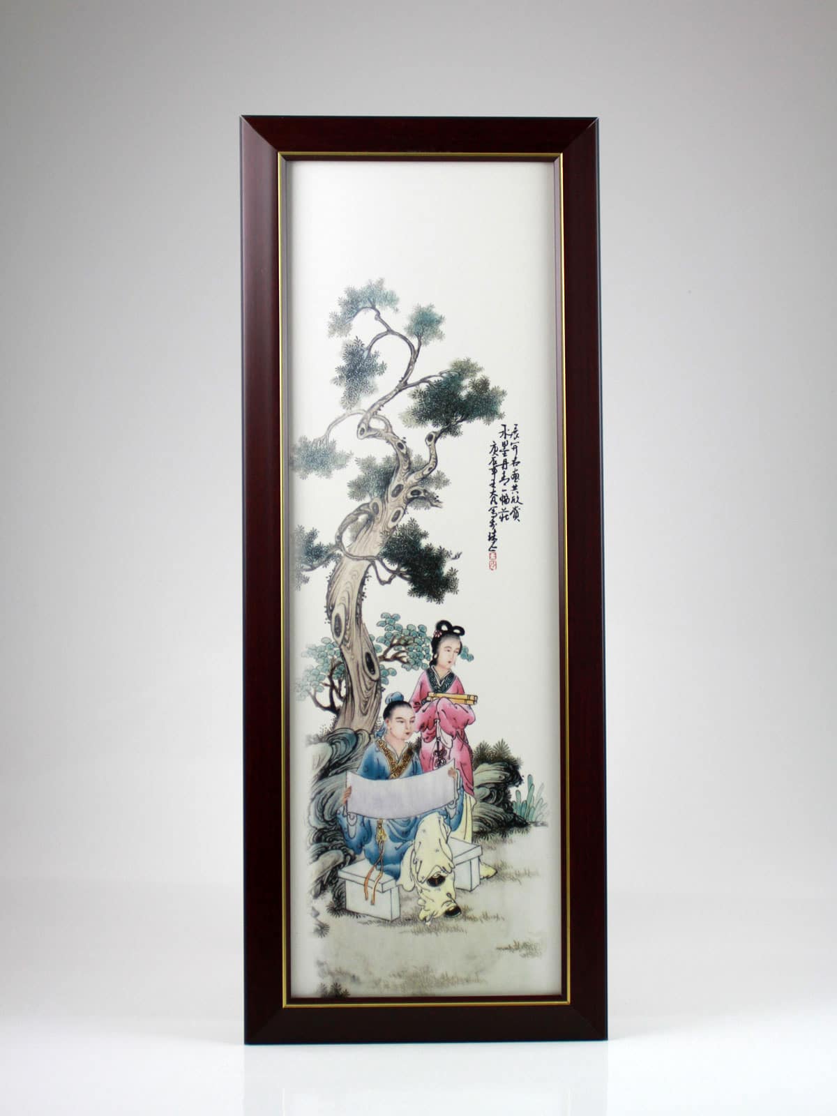 Stilvolles, chinesisches Wandbild aus Porzellan, eingefaßt in einen Bilderrahmen mit Aufhängevorrichtung rückseitig, als kunstvolle Wanddekoration.