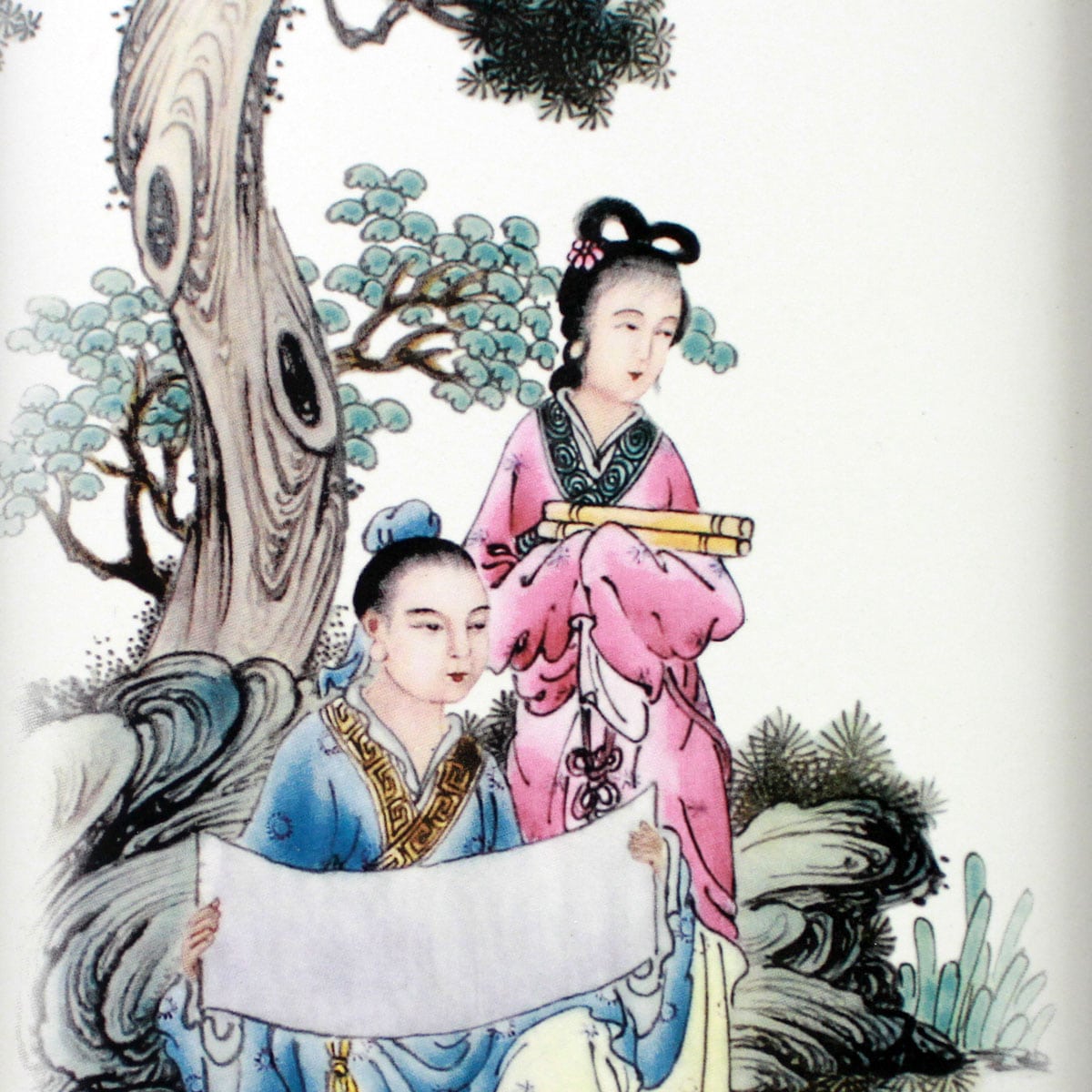 Dargestellt in ruhiger Atmosphäre sind zwei Chinesinnen im Garten, eine von ihnen hält ein ausgerolltes Bild in den Händen. Die chinesischen Schriftzeichen am oberen Rand bedeuten frei übersetzt „Die Ausstellung und die Wertschätzung berühmter Gemälde – Chinesische Kalligraphie und Malerei sind wie eine Blumenpracht“