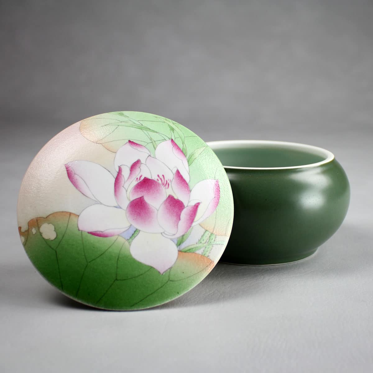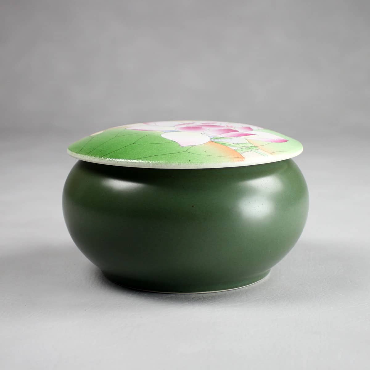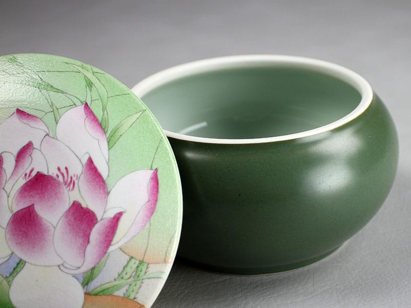 Das Motiv auf dem Deckel der qualitativ hochwertigen Porzellandose sind blühende Lotusblumen. In China sind sie Symbol für Schönheit und Reinheit.