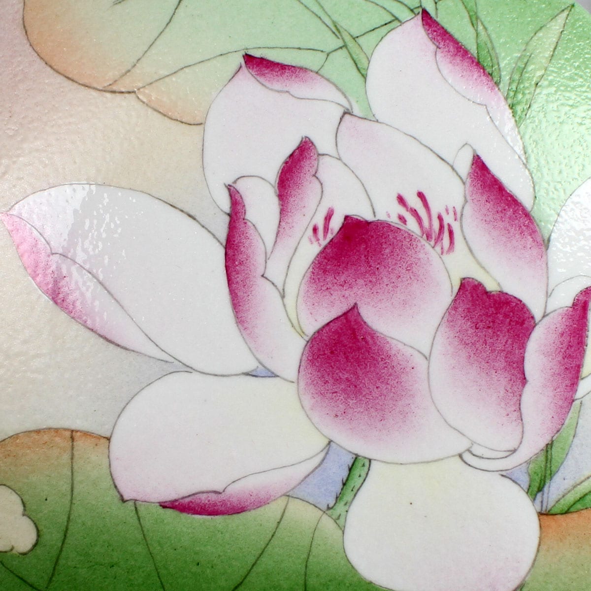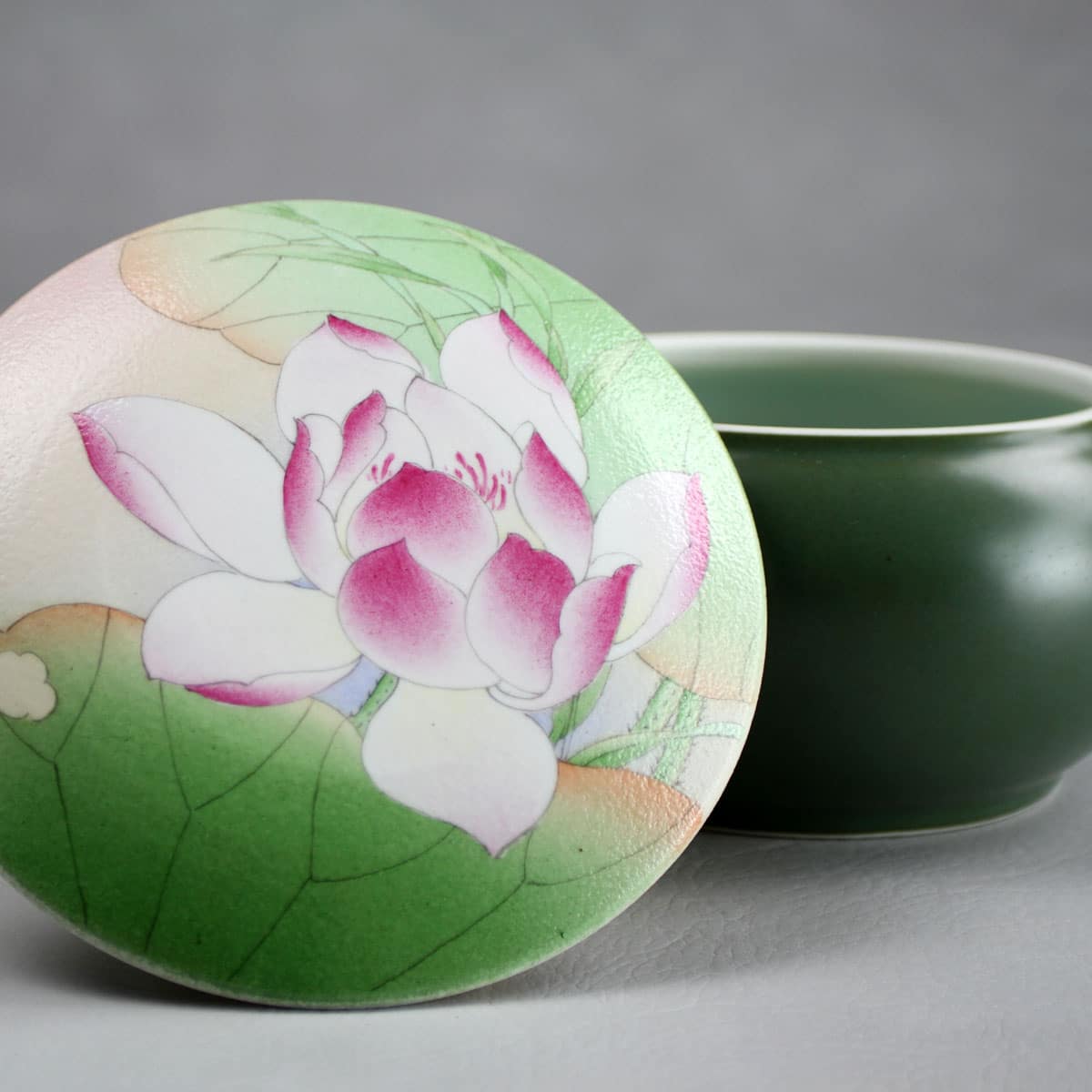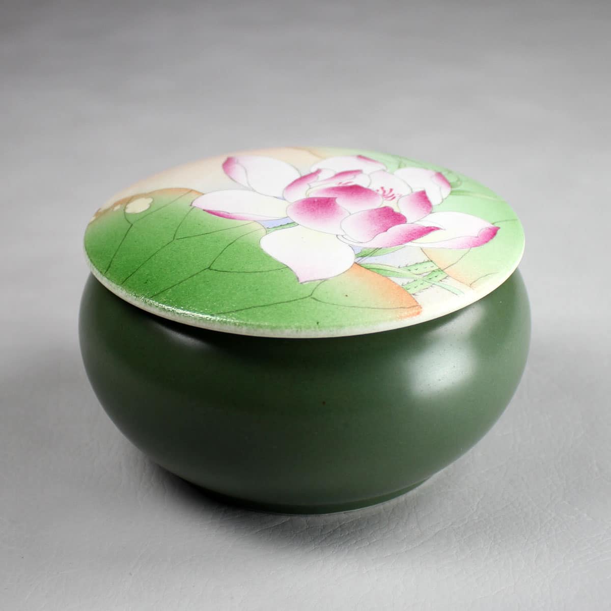 Das Motiv auf dem Deckel der qualitativ hochwertigen Porzellandose sind blühende Lotusblumen. In China sind sie Symbol für Schönheit und Reinheit.