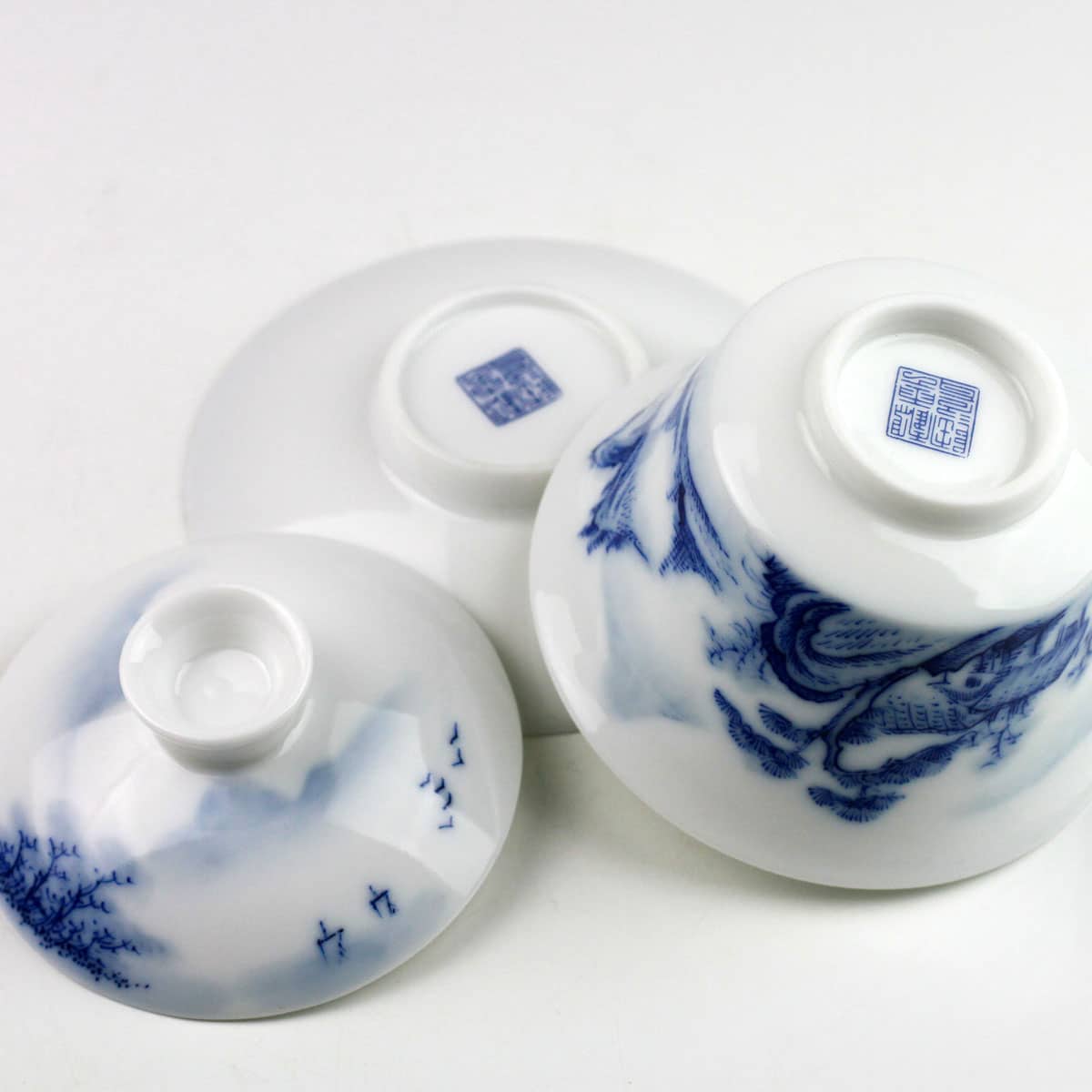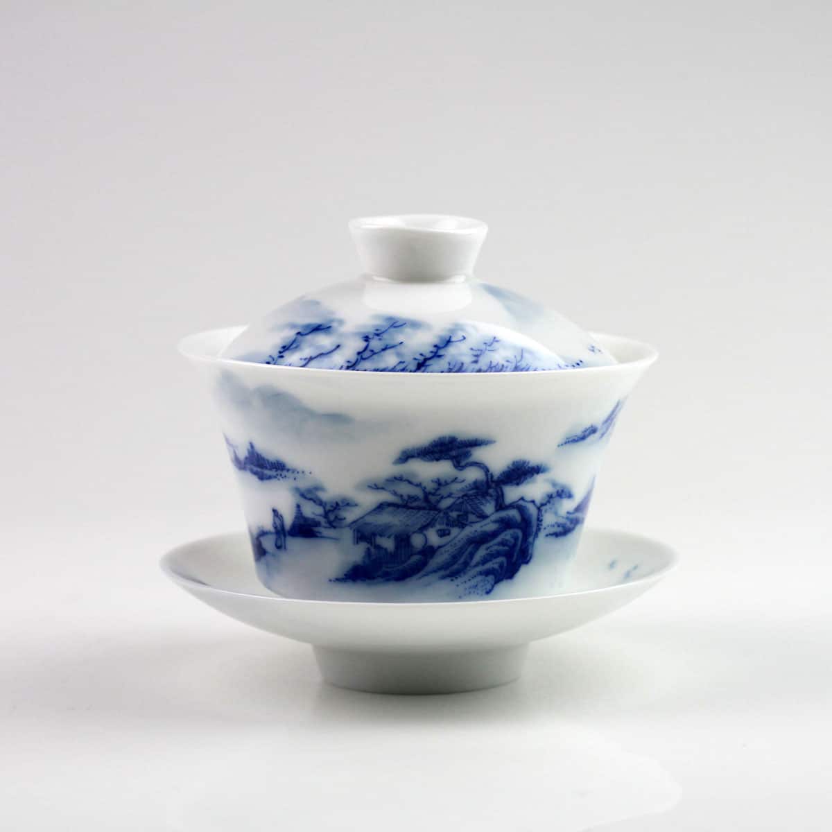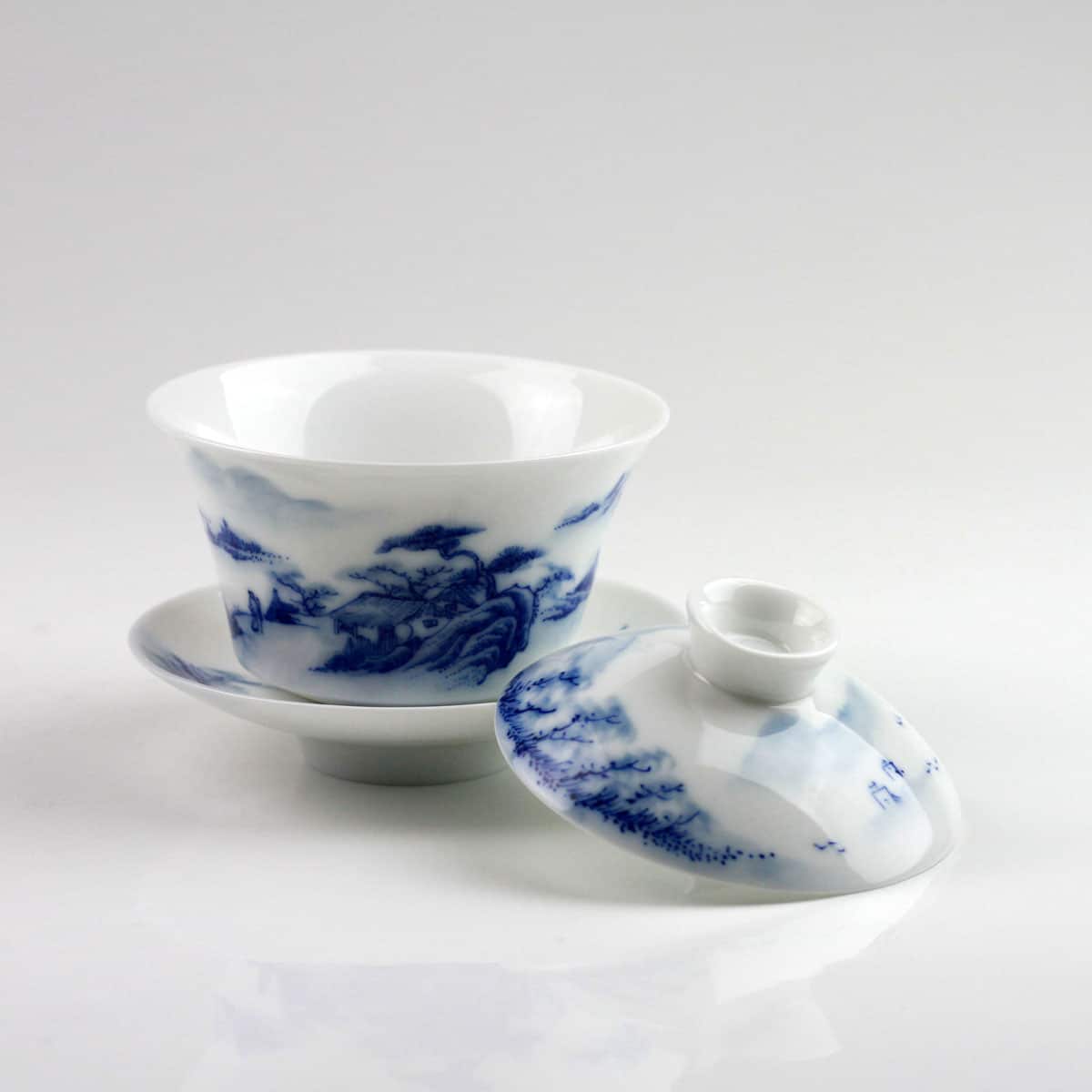 Chinesischer Gaiwan/Gaibei, Deckeltasse Porzellan blau-weiß, asiatische Teekultur