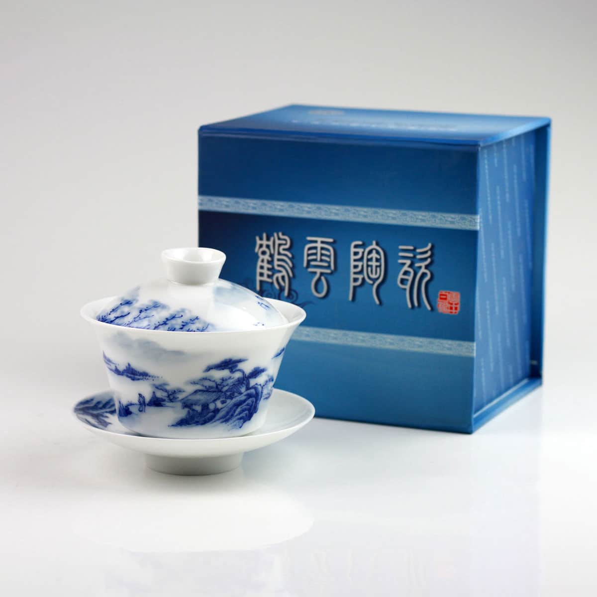 Traditionelle, von handgefertigte, nach speziellem Verfahren gebrannte, chinesische Teetasse mit Deckel, ein „Gaiwan“, aus besonders hochwertigem Porzellan, feinster und edelster Qualität. Handbemalt mit einer Szene eines chinesischen Bergdorfs oberhalb eines Sees in einer malerischen Landschaft.