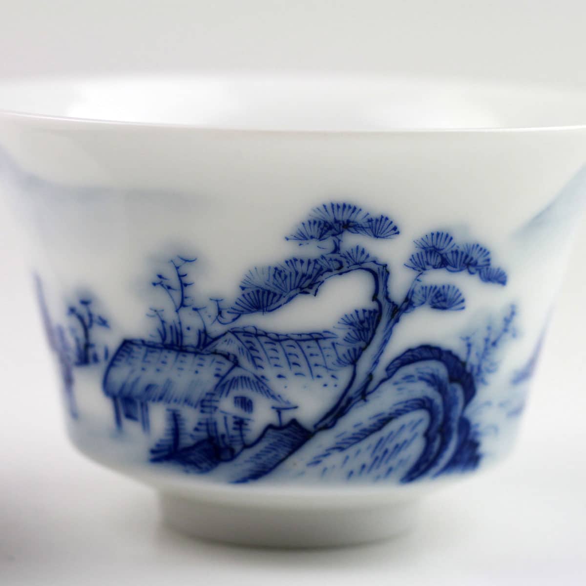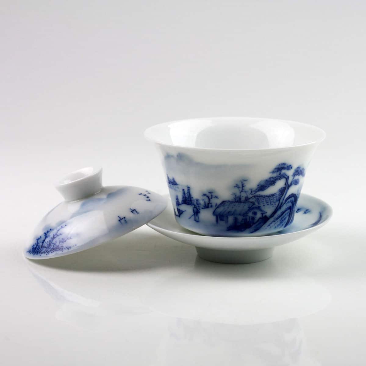 Gaiwan „Dorfidylle“, Porzellan-Teetasse mit Deckel, handbemalt