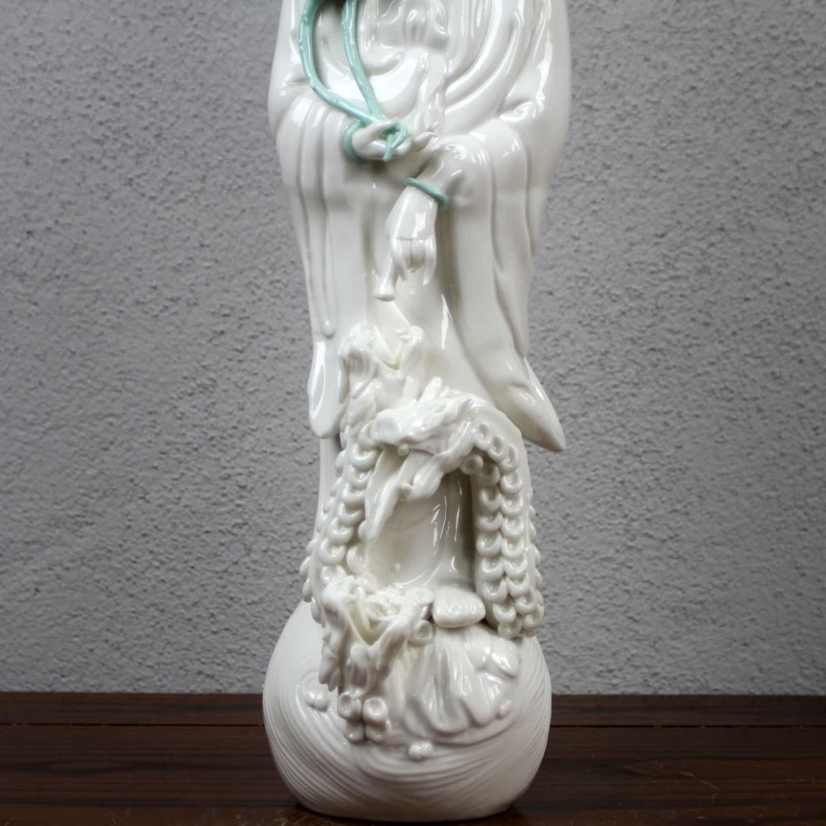 Chilian Guanyin (chi. 持莲观音, chí lián guān yīn) – Eine Ruhe ausstrahlende Guanyin-Porzellanfigur mit einer Lotusblume in ihrer rechten Hand, mit der linken gießt sie Lebensnektar aus der Phiole in den Rachen von einem der drei Drachen.