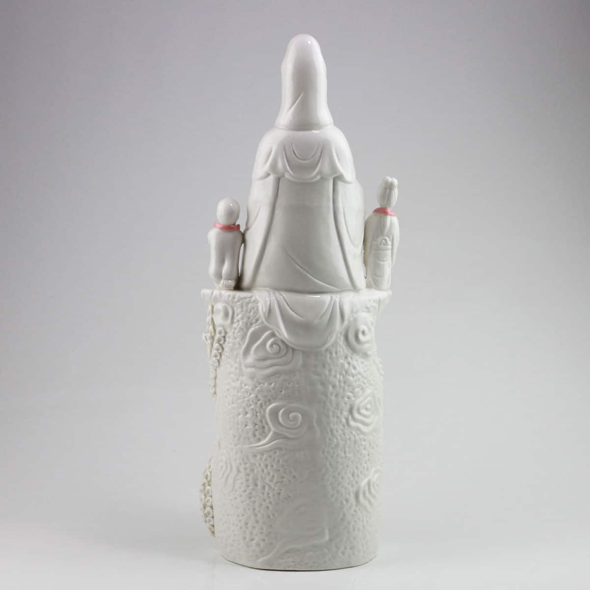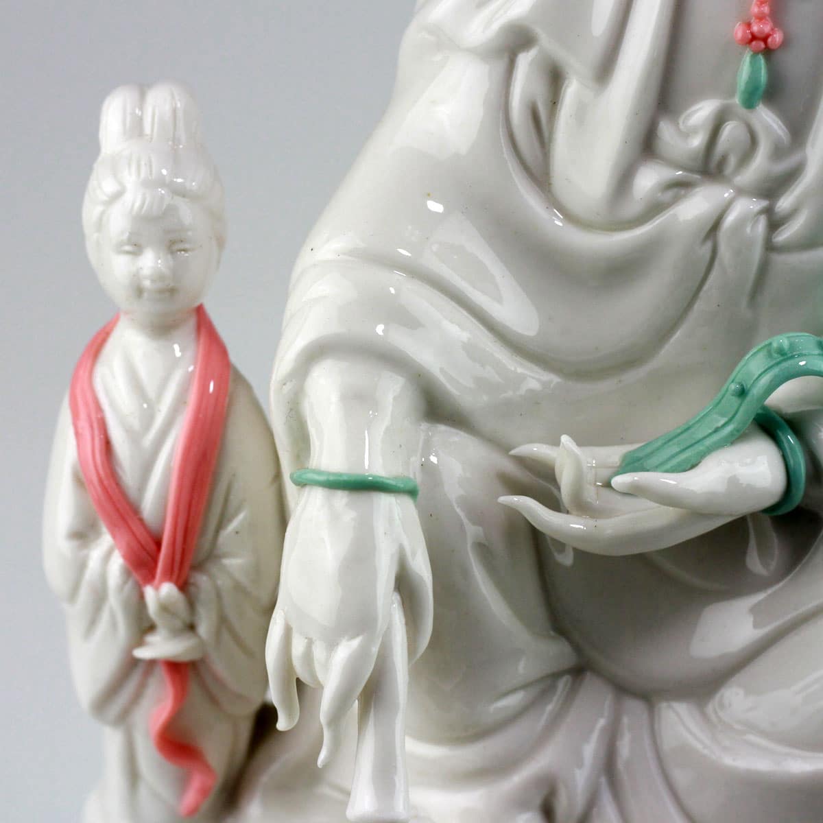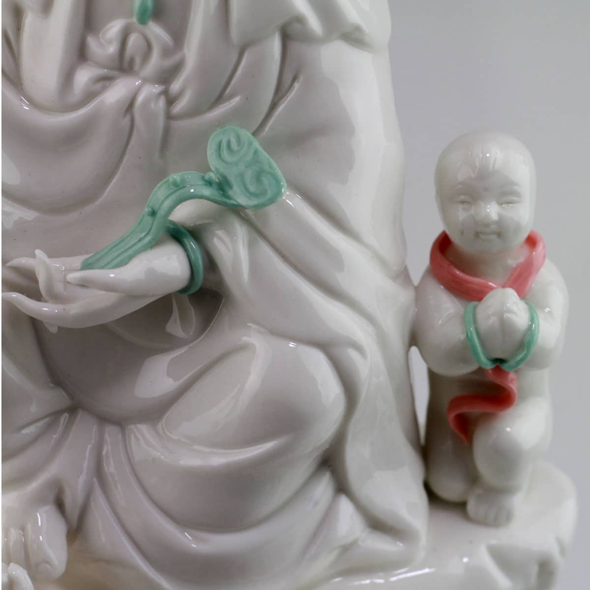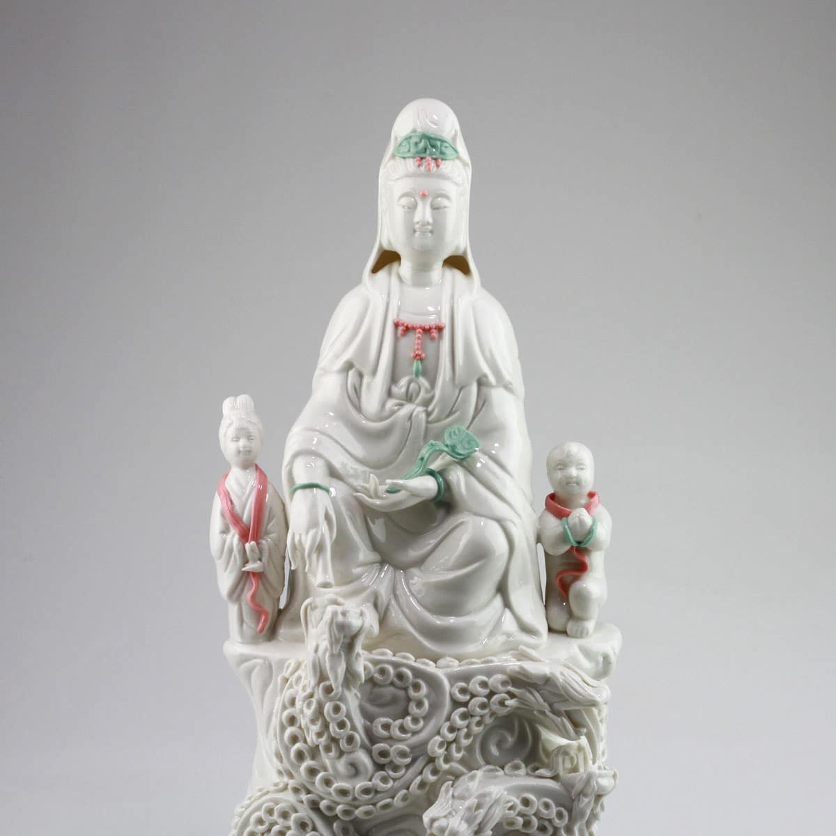 Diese anmutige Porzellanskulptur gemeinsam mit Kindern versinnbildlicht Glück und die Kraft der Fruchtbarkeit Guanyins. Die farblichen Akzente, sowie die zahlreichen feinen Details machen sie besonders. In ihrer linken Hand hält sie einen Lotuszweig – mit der rechten giesst sie den Lebensnektar in den Rachen des Drachen. Die Kinder an ihren Seiten symbolisieren den Kindersegen. Diese Kuan Yin sitzt auf einem hohen Sockel, der von 9 Drachen umschlungen ist. In China ist die Zahl Neun eine Glückszahl und steht für Langlebigkeit. Ausserdem ist sie das Symbol für den Drachen selbst und seine 9 Söhne (Männlichkeit).