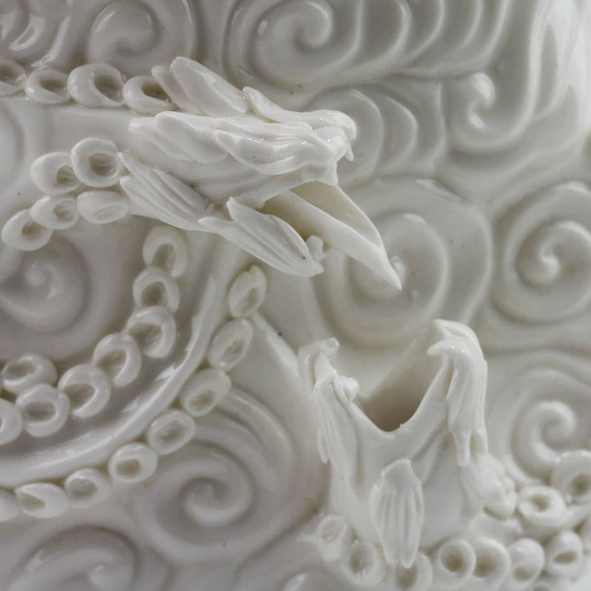 Das milchweiße bis cremefarbene Dehua-Porzellan oder auch „Blanc de Chine“ wurde erstmals in der Ming Dynastie gefertigt. Im Unterschied zum viel früher hergestellten Jingdezhen Porzellan weist es einen geringeren Eisenoxid-Gehalt auf. Dadurch kann es unter einer oxidierenden Atmosphäre gebrannt werden, die für den warmen Farbton dieses schönen Materials verantwortlich ist.