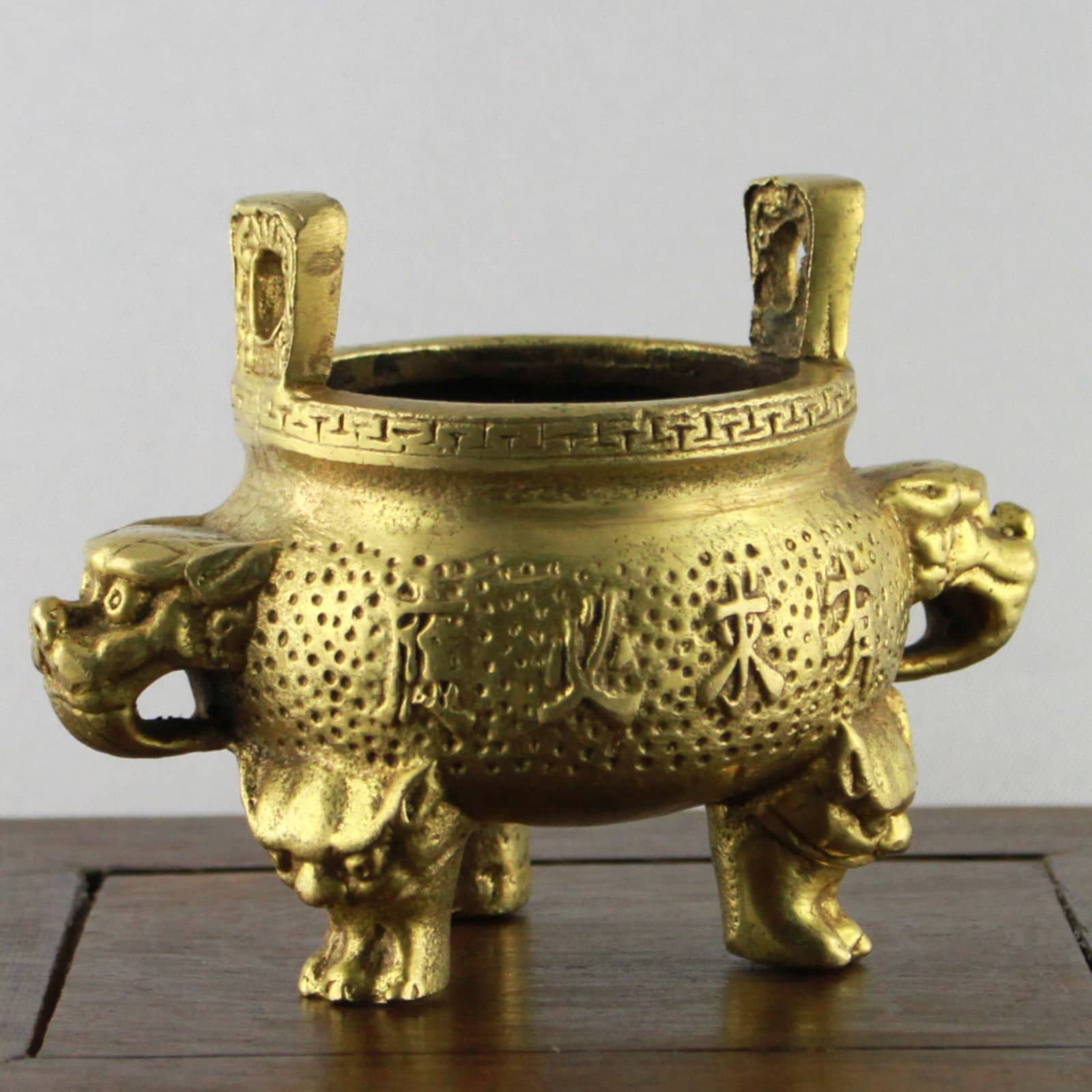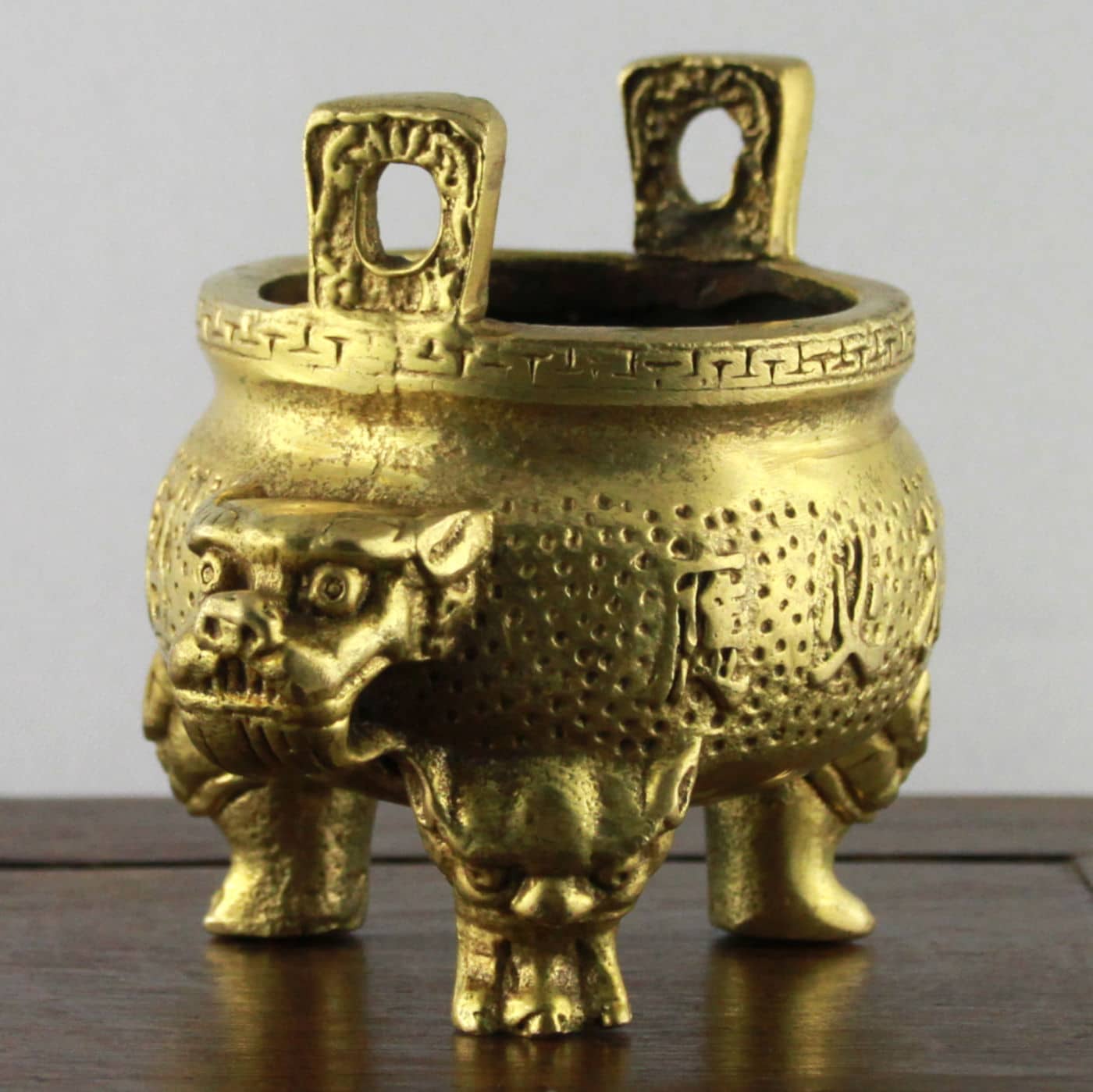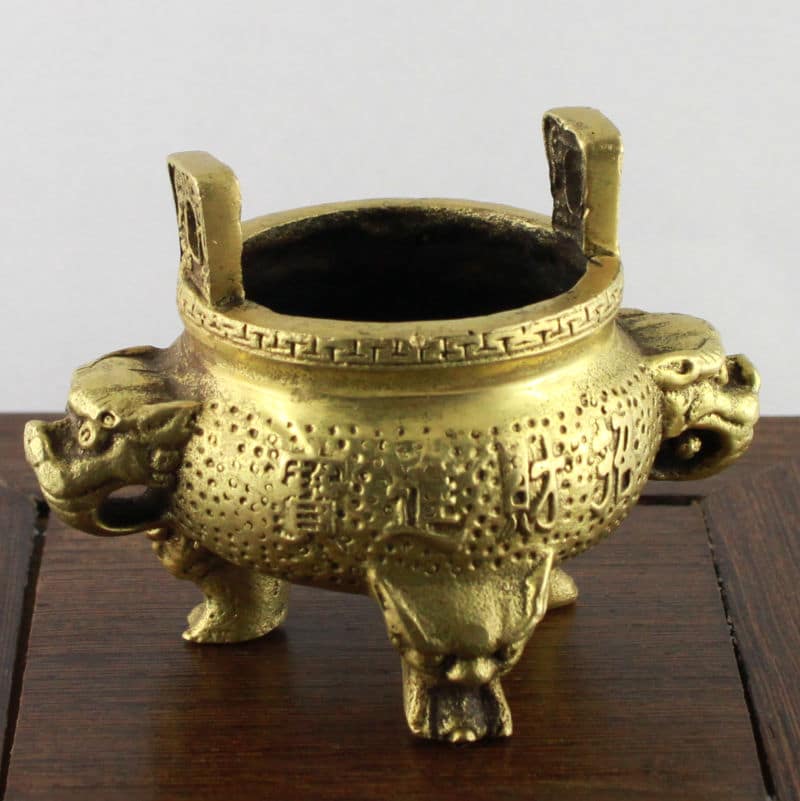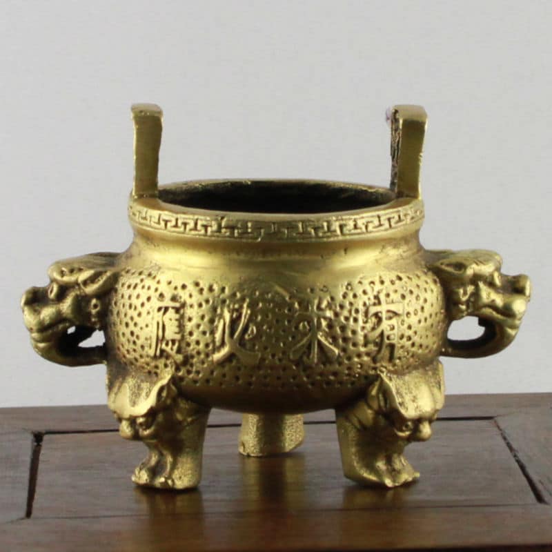 Das Gefäß ist in Form eines traditionellen Aufbewahrungs-, Koch- Wein- und später Zier- und Ritualgefäßes gestaltet, dessen dreibeinige Gestalt mit zwei gegenüberliegenden Henkeln bis ins chinesische Neolithikum zurückzuverfolgen ist. Die Aufschrift verspricht auf beiden Seiten in unterschiedlichen Schreibweisen und poetischen Formen künftigen Wohlstand und Glück. Die Seiten tragen Löwenköpfe, die für Schutz, Stabilität und Sicherheit stehen und in dieser Stellung als Symbol für Staat und Regierung interpretiert werden können. Die Füße des Gefäßes tragen die Form von Fledermäusen, welche wegen der Klanggleichheit ihres Namens (Fu) mit dem Wort Glück als Glücksbringer gelten.
