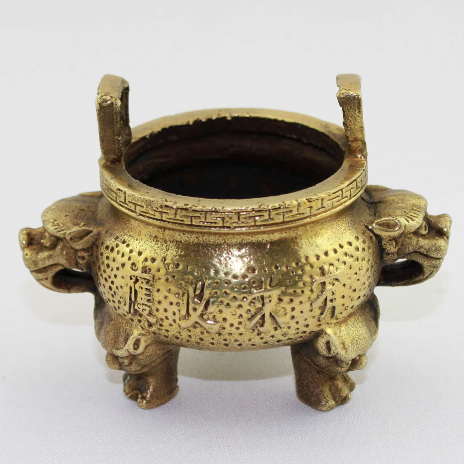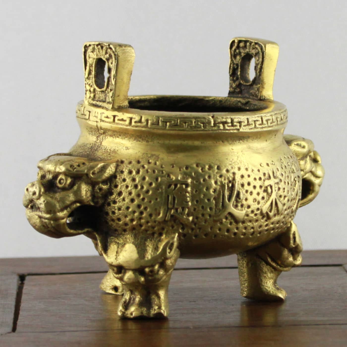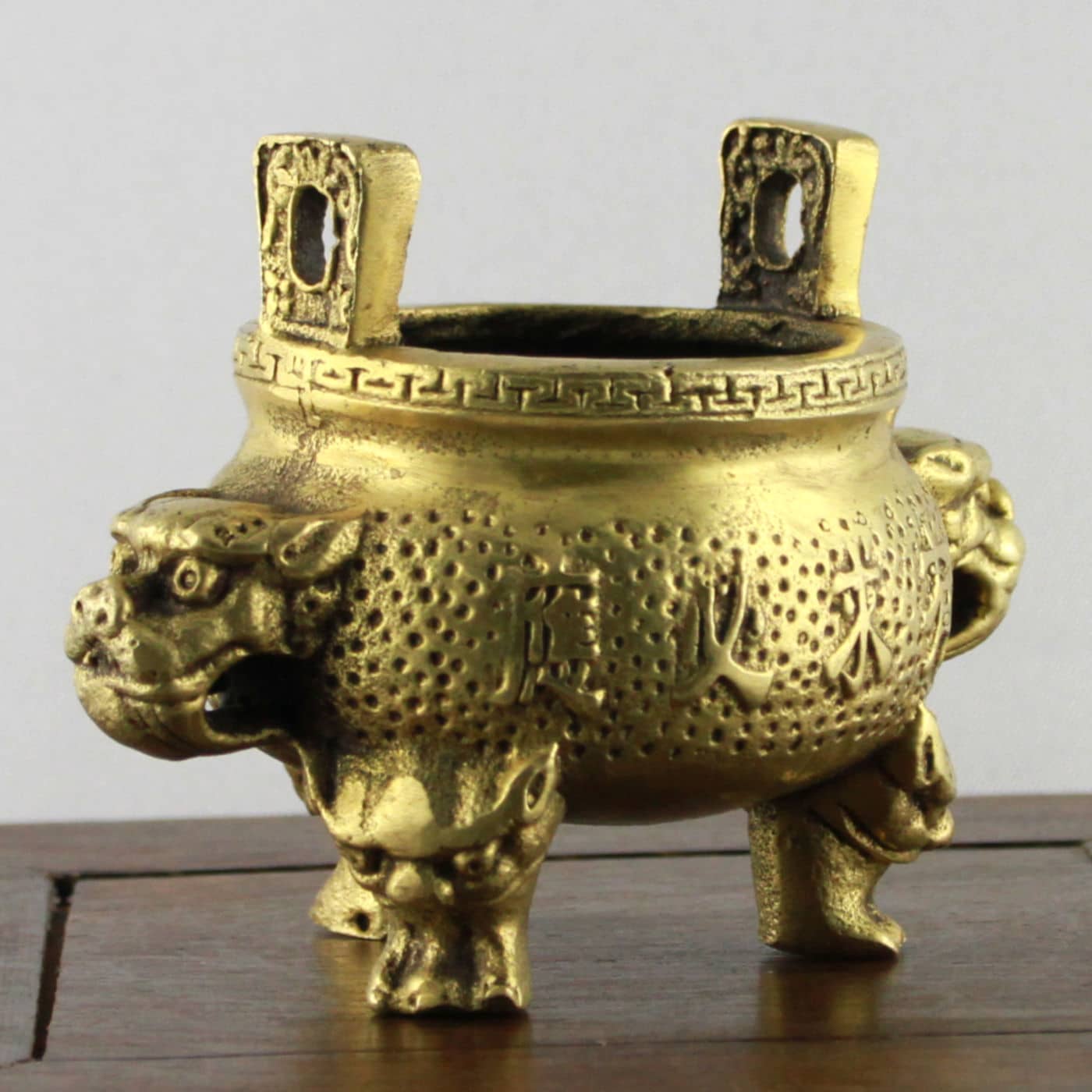 Das Gefäß ist in Form eines traditionellen Aufbewahrungs-, Koch- Wein- und später Zier- und Ritualgefäßes gestaltet, dessen dreibeinige Gestalt mit zwei gegenüberliegenden Henkeln bis ins chinesische Neolithikum zurückzuverfolgen ist. Die Aufschrift verspricht auf beiden Seiten in unterschiedlichen Schreibweisen und poetischen Formen künftigen Wohlstand und Glück. Die Seiten tragen Löwenköpfe, die für Schutz, Stabilität und Sicherheit stehen und in dieser Stellung als Symbol für Staat und Regierung interpretiert werden können. Die Füße des Gefäßes tragen die Form von Fledermäusen, welche wegen der Klanggleichheit ihres Namens (Fu) mit dem Wort Glück als Glücksbringer gelten.