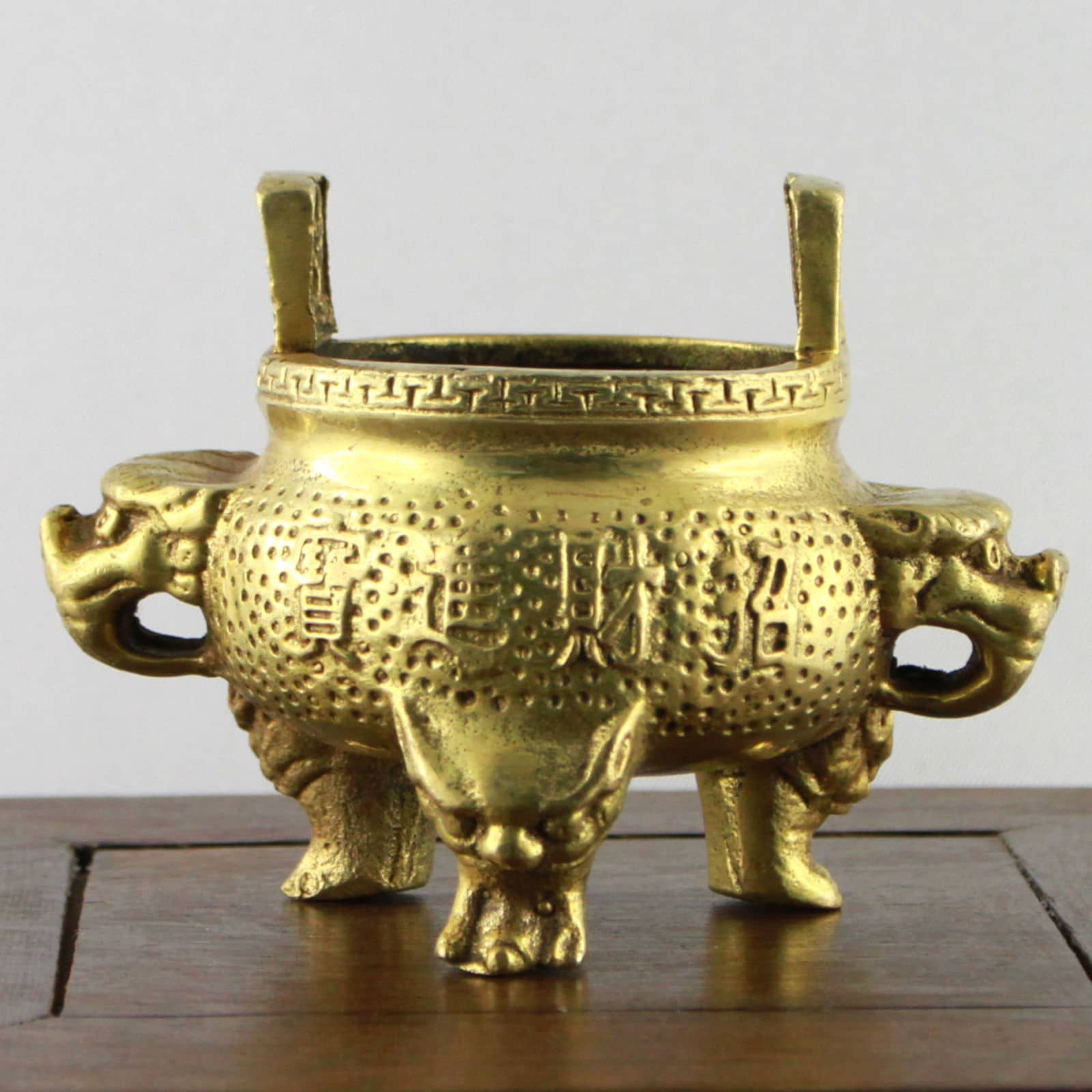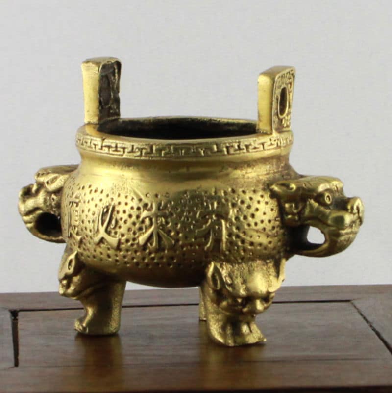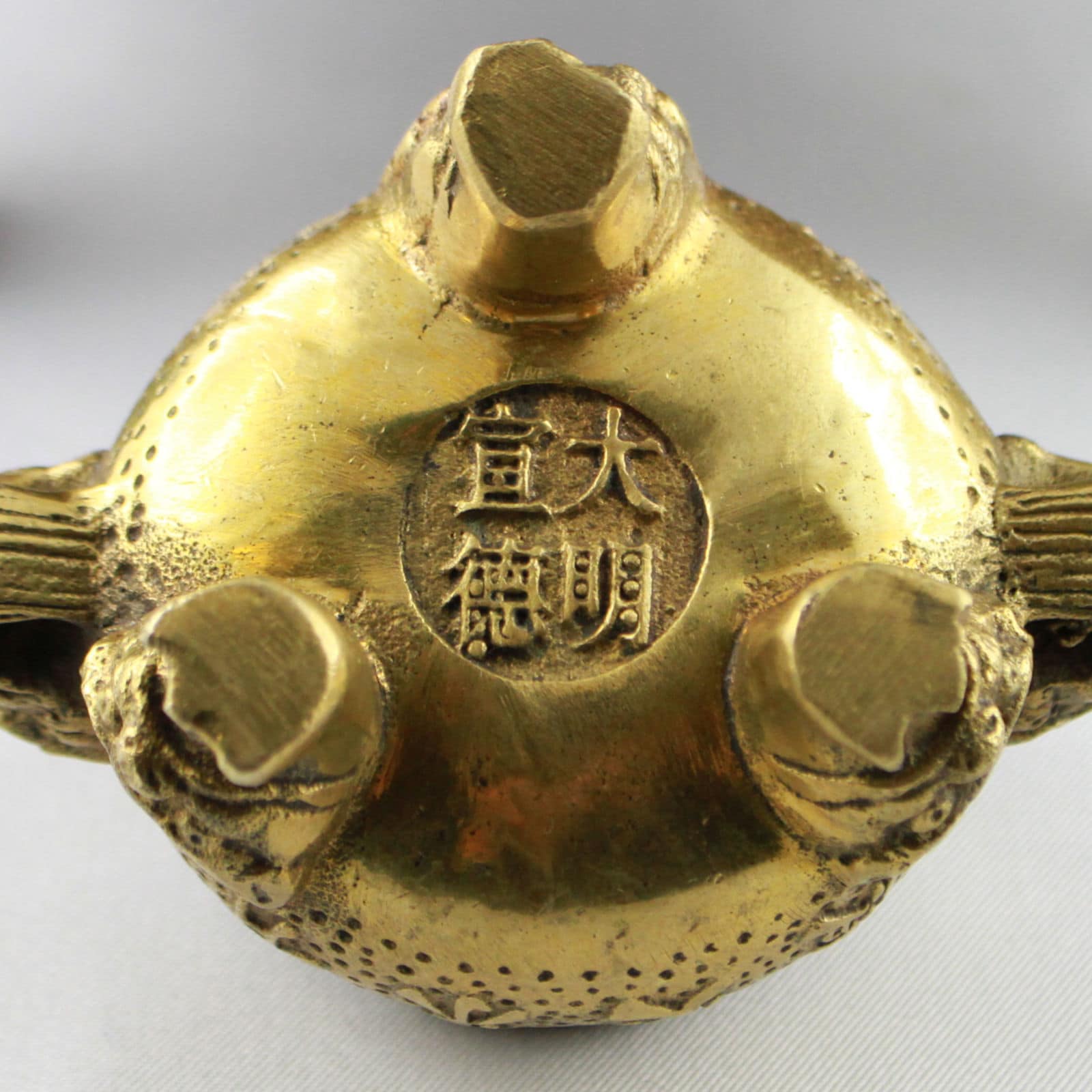 Miniatur-Replik eines zur Regierungszeit des Ming-Kaisers Xuande (bürgerlich Zhu Zhanji) zwischen 1425 und 1435 n. Chr. hergestellten traditionellen Bronzegefäßes, wie das Siegel („Da Ming Xuande“) beschreibt. Xuande galt bis zu seinem unerwarteten Ableben als Freund und Förderer der Künste ein hohes Ansehen genoss. Seine Regierungszeit gilt als bedeutendste Blüteperiode der chinesischen Handwerkskunst im Rahmen der Ming-Dynastie.
