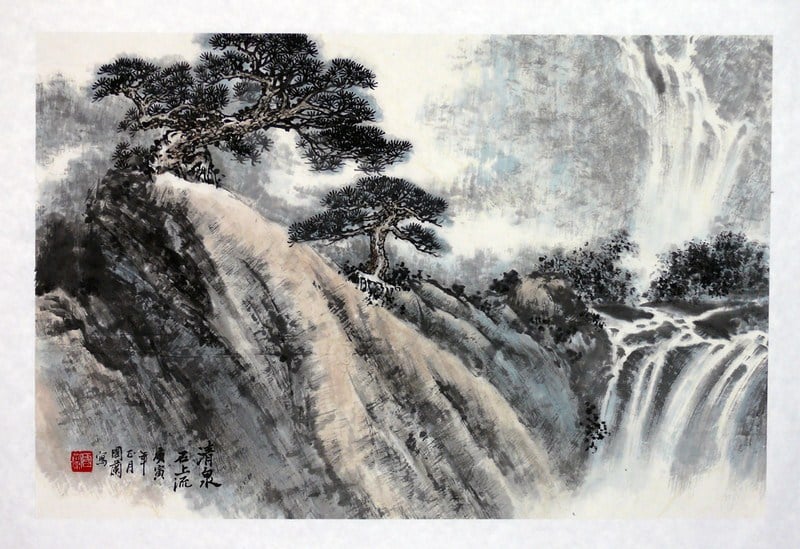 Als Grundfarbe benutzt die Künstlerin nur schwarz-weiß Töne. Der Wasserfall fließt wie ein Silberfluss den Gipfel hinunter. Obwohl der Mond selbst nicht auf dem Bild erscheint, kann man durch die weißen Töne den Mond im Bild spüren. Das Bild strömt ein sehr zärtliche und gefühlvolle Stimmung aus.