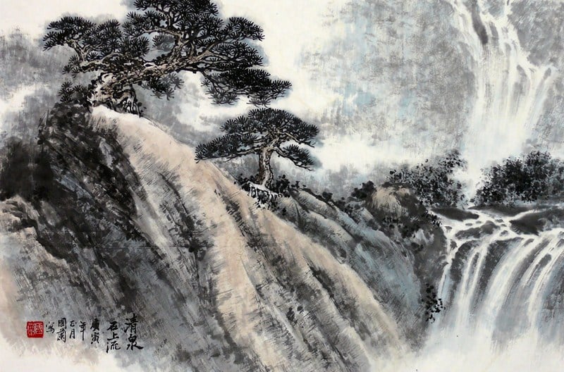 Bei diesem Bild handelt es sich um eine Darstellung eines Gedichtstückes des berühmten Dichters Wangwei: „„Heller Mond strahlt zwischen dem Kiefernwald und das klare Wasser fließt über die silbernen Steine “.
