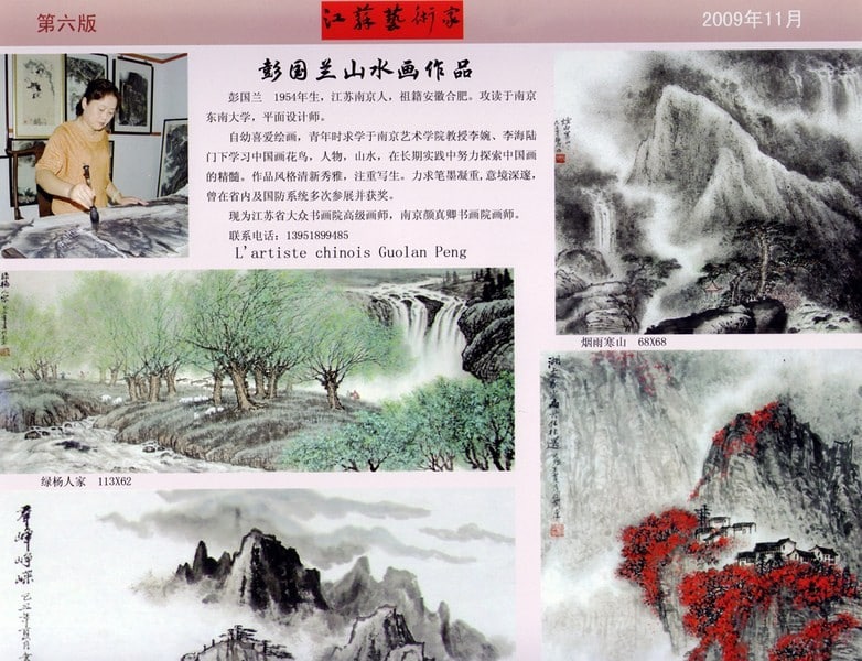 Peng Guo Lan, geboren 1954 in Nanjing, hat ihre Wurzeln in Hefei (Provinz Anhui). An der „Süd-Ost-Universität“ Nanjing studierte sie Grafik und Design. Das Malen von Blumen, Fischen, Figuren, Landschaften und Vögeln lernte sie bei den Professoren Li Wan und Li Hai Lu. Frau Peng erforschte in ihrer langjährigen Praxis die Nuancen der chinesischen Malerei in deren ganzer Vielschichtigkeit. Ihre Bilder sind frisch, mit Schwung und trotzdem sehr fein gemalt. Gleichzeitig ist sie immer bemüht, besondere Gefühle und Stimmungen zu vermitteln. Ihre Kunstwerke wurden mehrmals in der Provinz Jiangsu ausgestellt und brachten Peng Guo Lan zahlreiche Auszeichnungen ein.