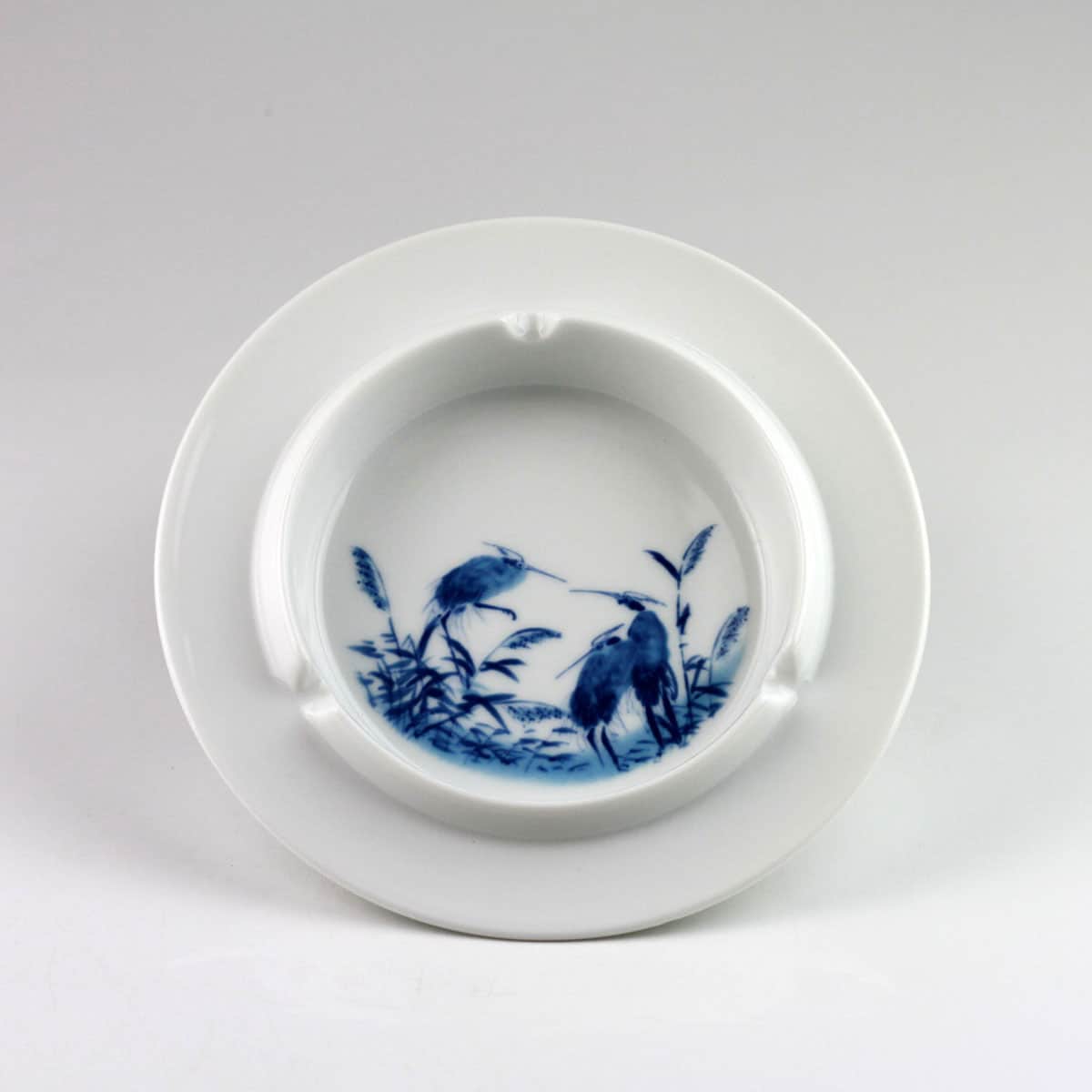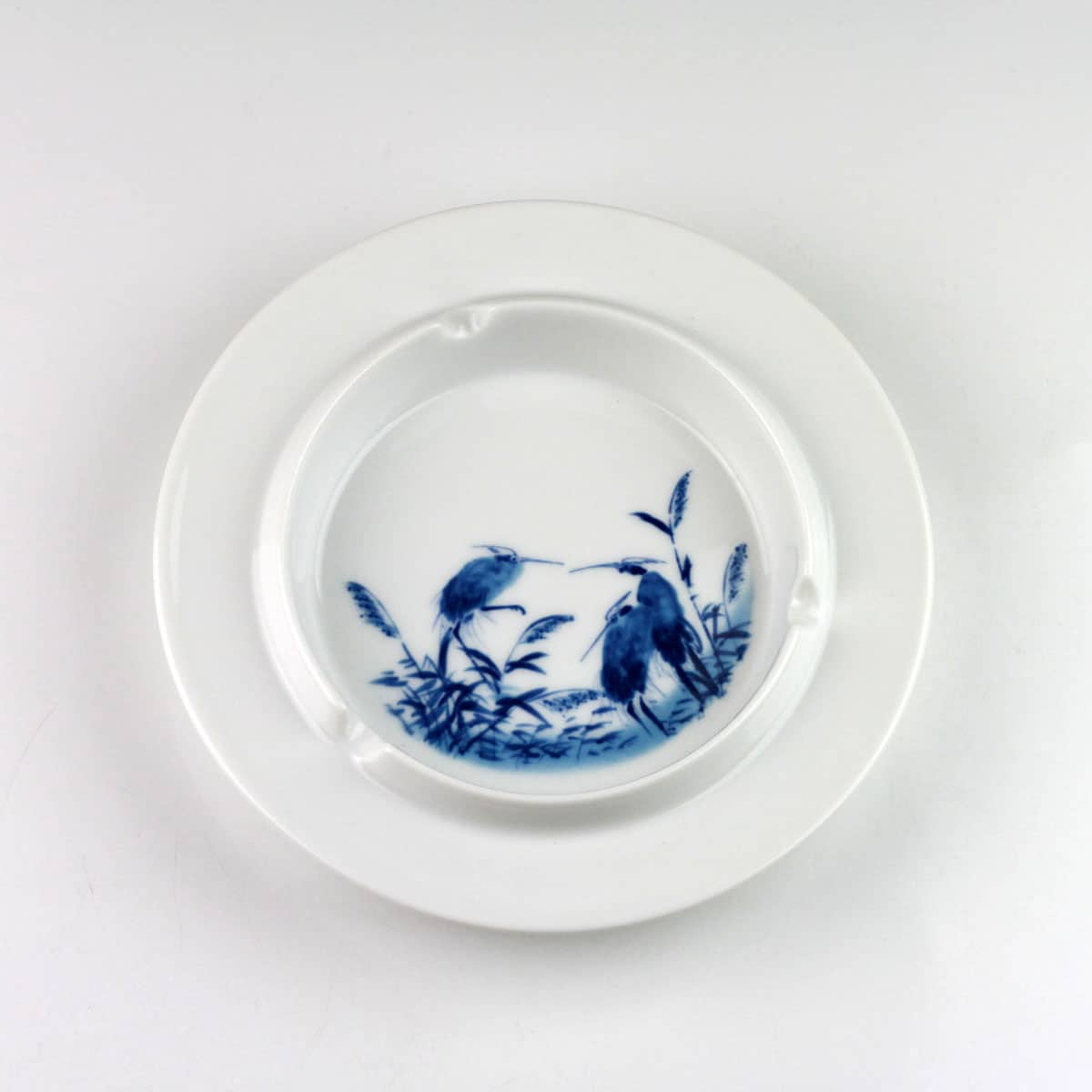 Aschenbecher „Reiher im Schilf“, Porzellan blau-weiß, Kalligraphie Farbmischschale