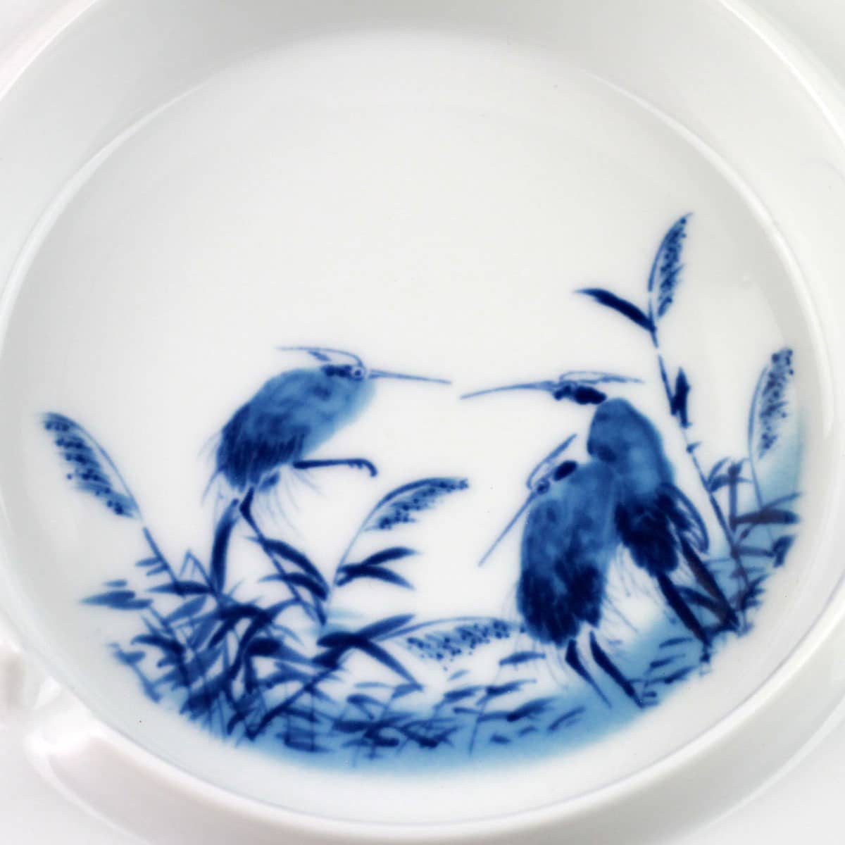 Das schöne Natur-Motiv von Reihern, die ruhig und besonnen im Schilfgras ihre Umgebung beobachten, zieren den Porzellan-Aschenbecher. In China gelten Reiher als Glücks- und Krafttiere. Auf der Rückseite des Porzellans befinden sich chinesische Schriftzeichen mit der Bedeutung „Frühling in Jingdezhen“.