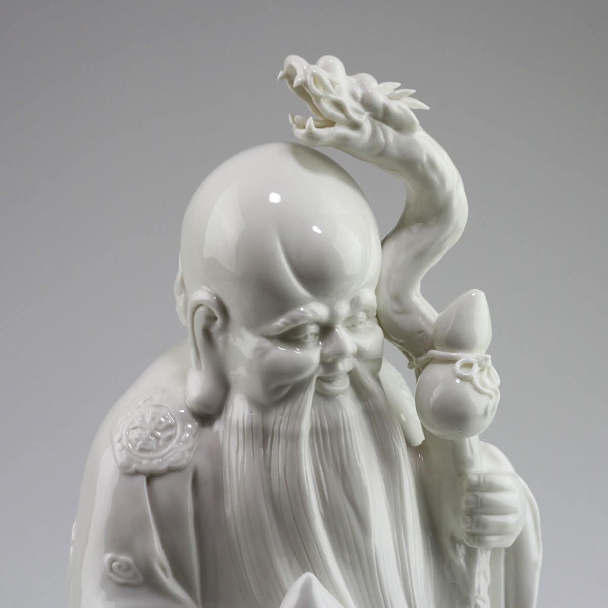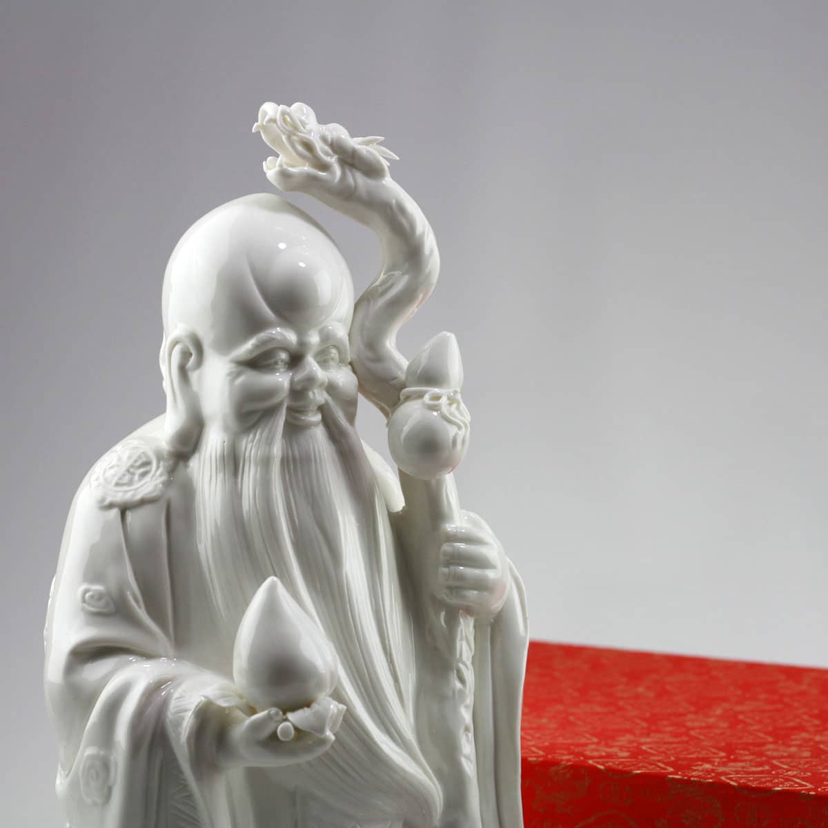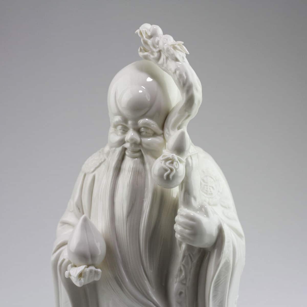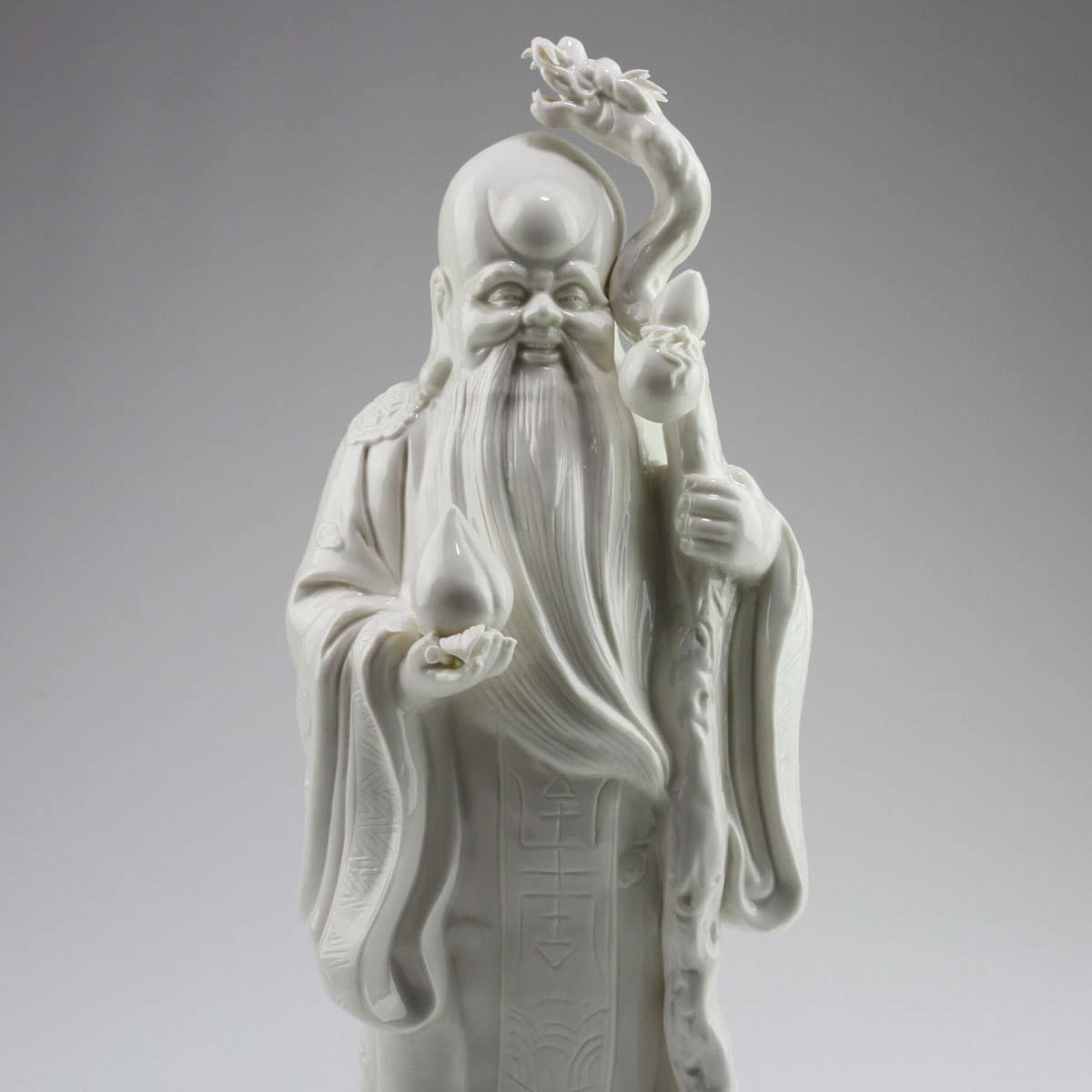 Diese Blanc de Chine Porzellanskulptur stellt den Gott der Gesundheit, der Langlebigkeit „Shou“ dar. Seine typischen Merkmale sind die hohe, gewölbte Stirn und der lange Bart. Das traditionellen Gewand, welches mit Glückssymbolen versehen ist, zeigt ihn als weisen Mann. Er hält in seiner linken Hand den kraftvollen Drachenstab fest, in der anderen trägt er das Symbol der Unsterblichkeit, einen Pfirsich.