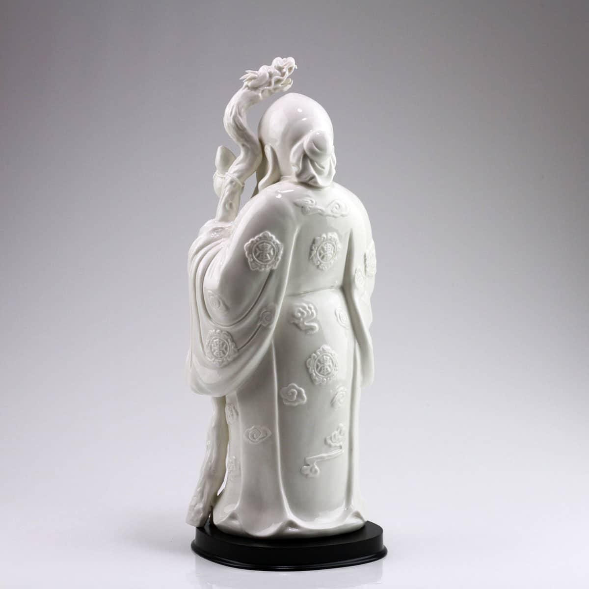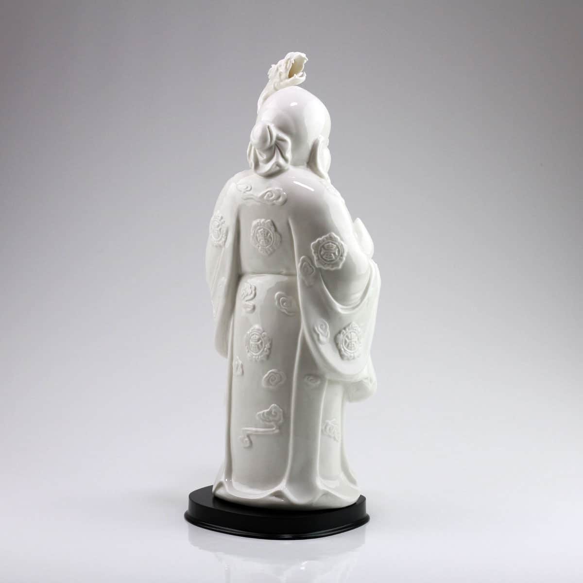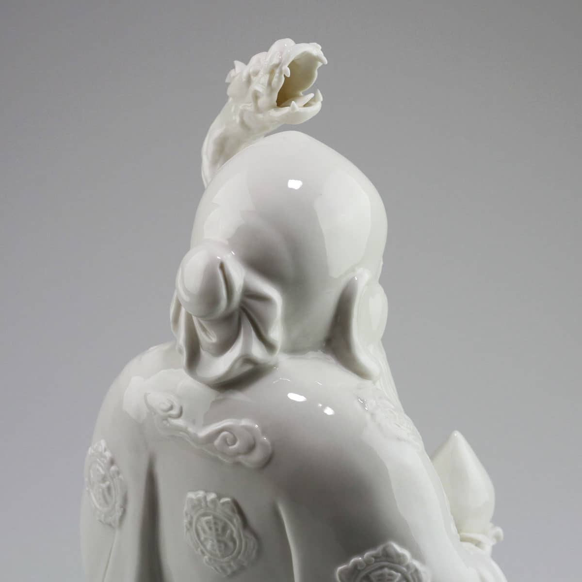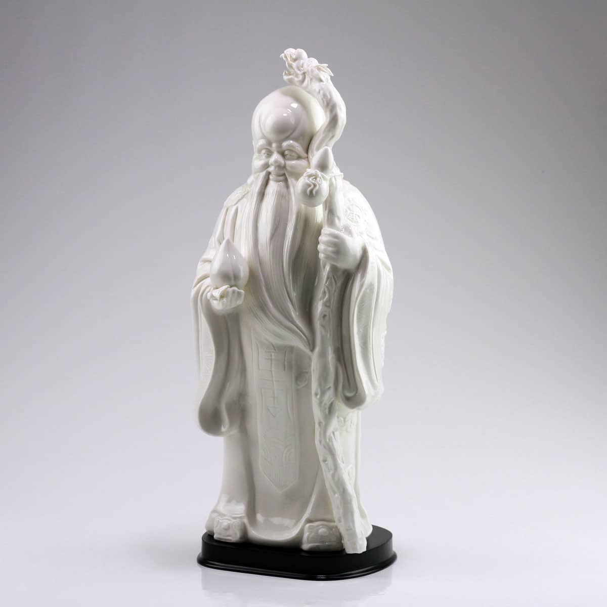Diese Blanc de Chine Porzellanskulptur stellt den Gott der Gesundheit, der Langlebigkeit „Shou“ dar. Seine typischen Merkmale sind die hohe, gewölbte Stirn und der lange Bart. Das traditionellen Gewand, welches mit Glückssymbolen versehen ist, zeigt ihn als weisen Mann. Er hält in seiner linken Hand den kraftvollen Drachenstab fest, in der anderen trägt er das Symbol der Unsterblichkeit, einen Pfirsich.