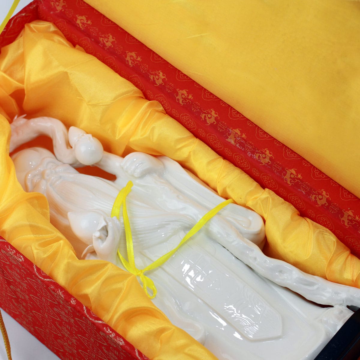 Der charakteristische Farbton des Blanc de Chine macht die aus ihm gefertigten Figuren unverwechselbar und harmoniert ausgezeichnet mit der friedvollen und majestätischen Ausstrahlung der buddhistischen und aus der Mythenwelt Chinas stammenden Motive.