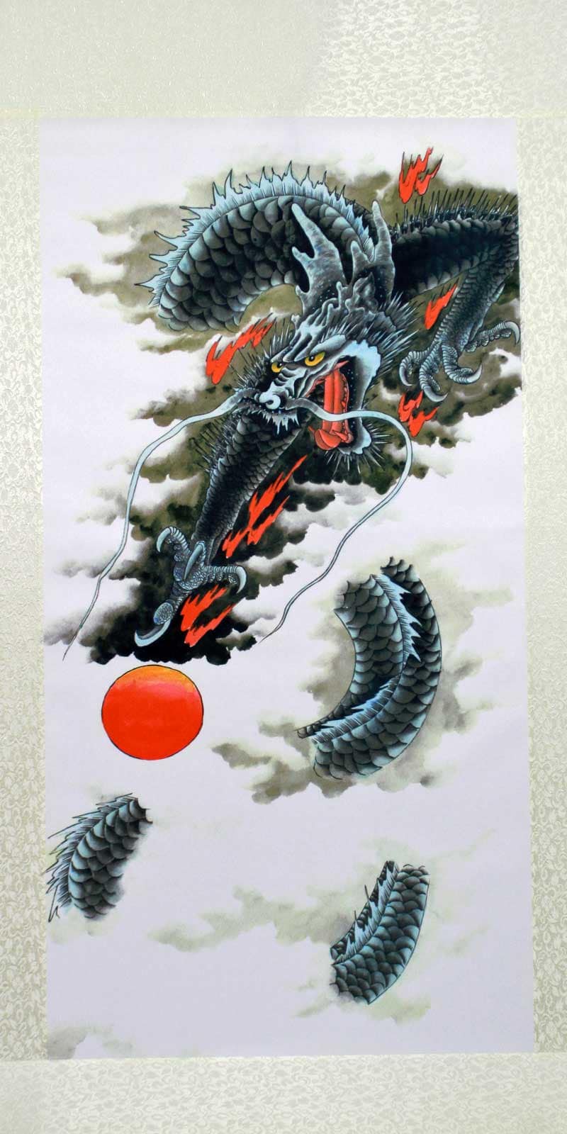 Japanisches Rollbild Drache, Druck auf feinem Stoff, Long Glücksdrache