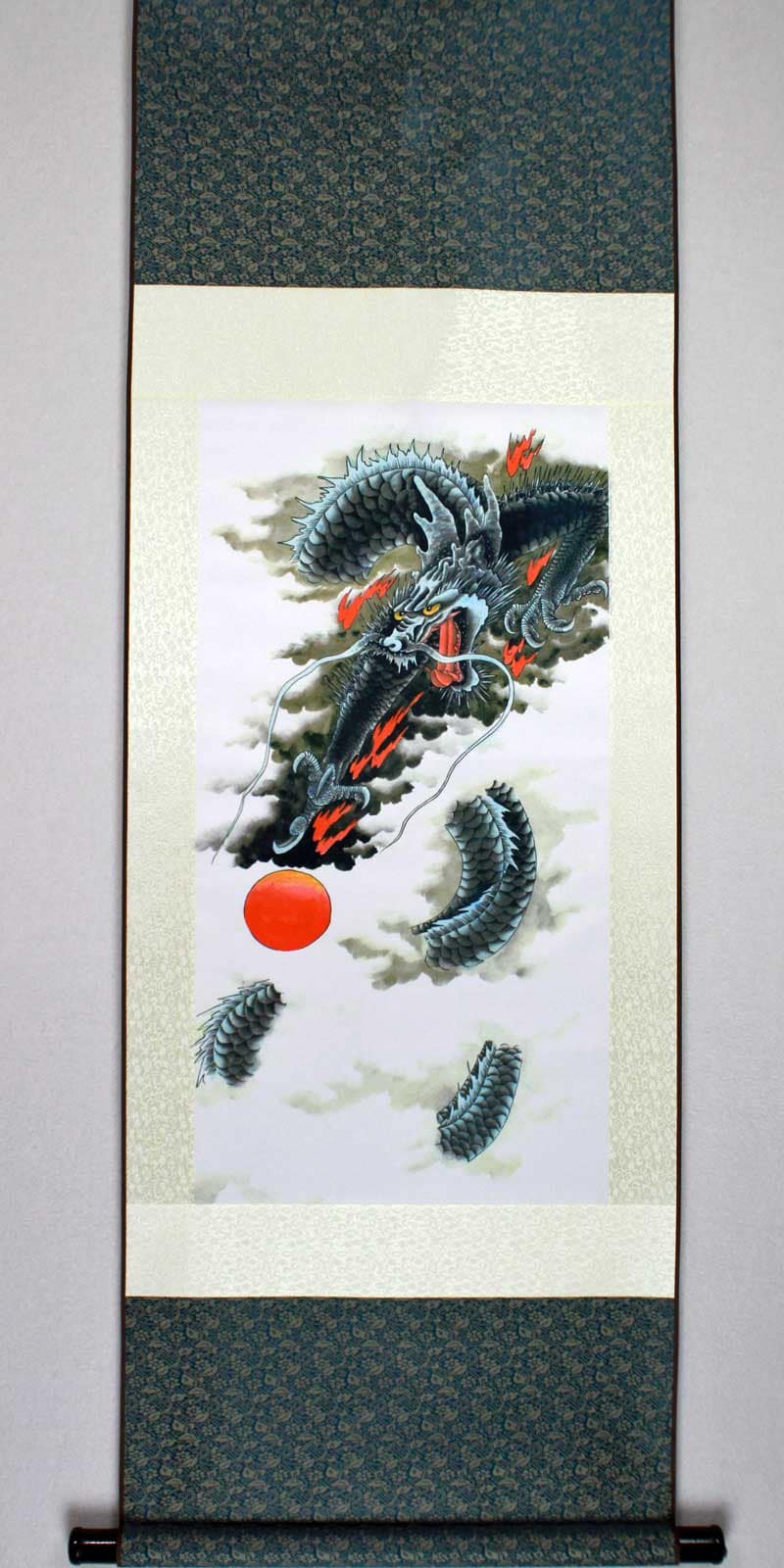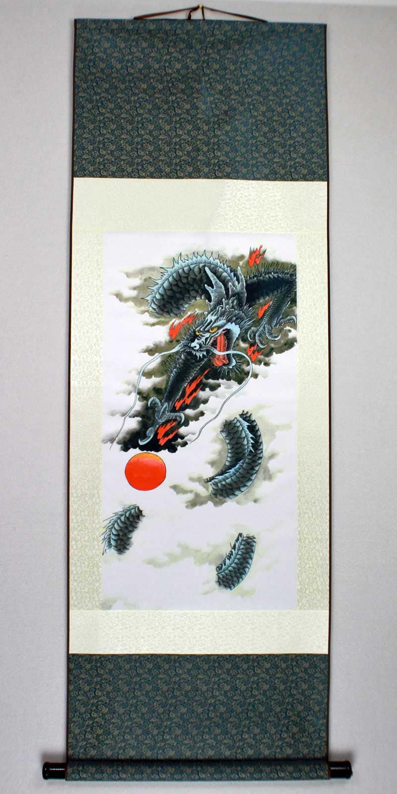 Traditionelle Drachendarstellung (japanischer Stil) – Druck auf feinem Stoff mit mehrstufigem, verziertem Passepartout. Der obere Rand des Bildes ist auf ein flaches, rechteckiges Stück Holz aufgezogen. An einer daran befestigten, gebundenen Schlaufe kann das Bild direkt an bspw. Nagel, Schraube oder Haken eingehängt werden. Der untere Rand des Passepartouts ist lackierten Holzknäufen beschwert.
