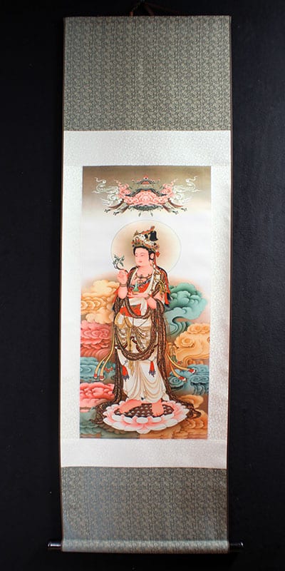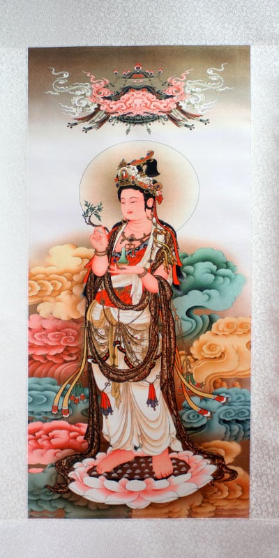 Unsere Buddhistischen Rollbilder zeigen die schönsten und bekanntesten Motive des Mahayana-Buddhismus (Sanskrit महायान, mahā: „groß“, yāna: „Fahrzeug“). Die erste der Vier Edlen Wahrheiten des Buddhismus besagt, dass das gesamte Leben im Daseinskreislauf mit Leid erfüllt ist. Im Mahayana-Buddhismus strebt der Übende eine Beendigung dieses Leids an. Jedoch nicht nur die Beendigung seines eigenen Leids, sondern auch die des Leids aller Lebewesen auf der Erde – ausnahmslos. Wesen, die die Erleuchtung aller anderen Lebewesen als Ziel ihres eigenen Weges zur Erleuchtung ansehen, werden Bodhisattvas genannt. Die Bodhisattvas Avalokiteshvara (dessen weibliche Form die Guanyin darstellt), Manjurishi, Tara und Maitreya sind hierbei die Figuren mit der größten Bedeutung. Als Buddha wird hingegen ein Mensch oder auch transzendentes Wesen bezeichnet, der oder das bereits zu Lebzeiten aus eigener Kraft und eigenem Antrieb die Reinheit und Vollkommenheit des Geistes erreicht hat. Dadurch wurde der Kreislauf der Wiedergeburt durchbrochen und somit das Leid beendet. Es gibt viele Buddhas, von denen der wohl bekannteste Siddharta Gautama ist. Er gilt als Begründer der Religion des Buddhismus und ist auch unter seinen Ehrennamen Buddha Shakyamuni und Tathagatha bekannt. Die meisten Buddhas waren in früheren Reinkarnationen ebenfalls Bodhisattvas.
