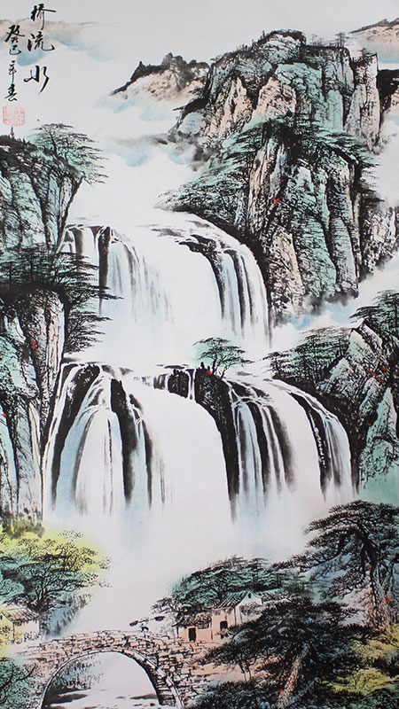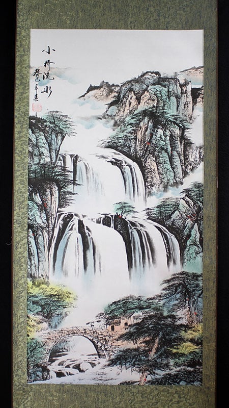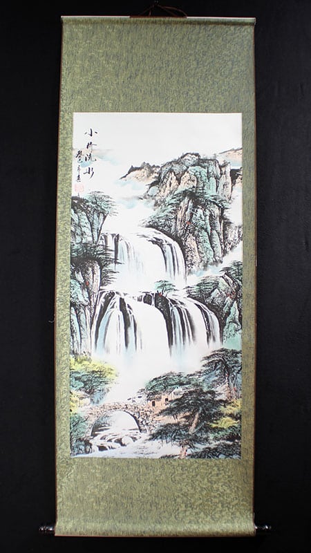 Ein klassisches und beeindruckendes Motiv: Ein rauschender Wasserfall stürzt in mehreren Stufen einen bewachsenen Hang hinab und verschwindet in der aufwallenden Gischt. Am Fuße entdeckt man ein kleines Dorf das durch eine Brücke verbunden ist. Die kraftvolle Natur zeigt in diesem Rollbild ihre ganze Pracht.