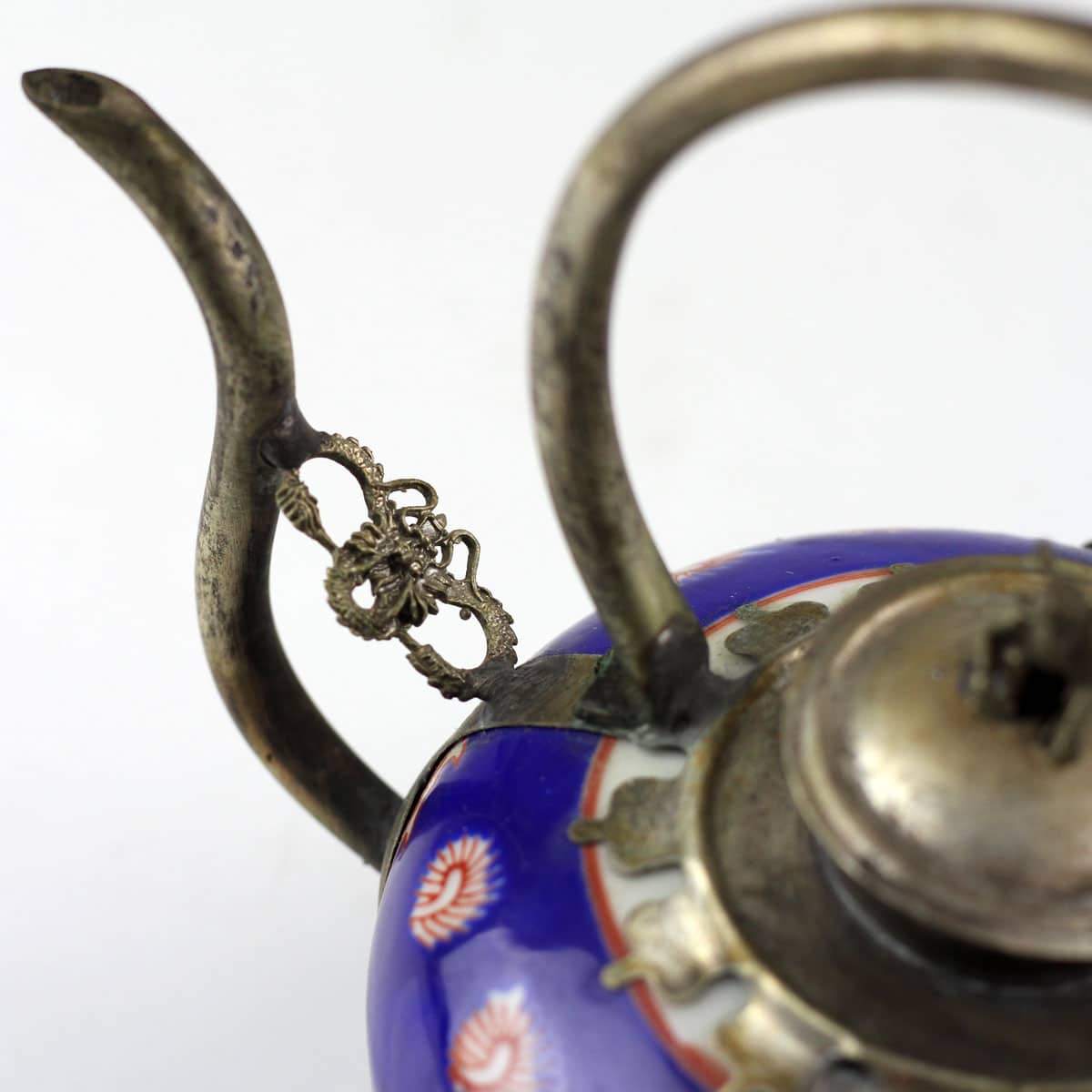Feines Porzellan und silberfarbene Messingornamente machen dieses Zierkännchen im antiken Stil zu einem besonderen Blickfang. Filigrane Abbilder des Drachen und des Phönix – die kaiserlichen Symbole für die harmonische Vereinigung von Mann und Frau – fassen die handglasierte Keramik ein. Ein wunderschönes Geschenk für jeden Sammler asiatischer Kunstgegenstände.