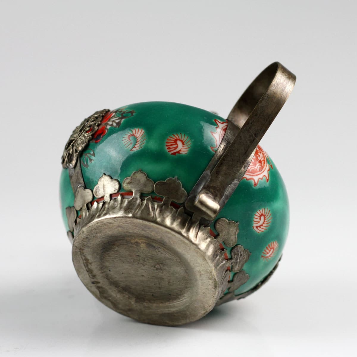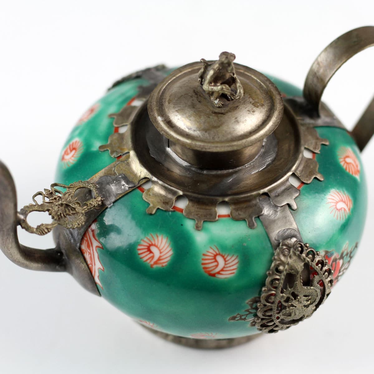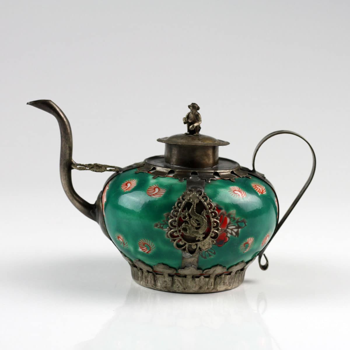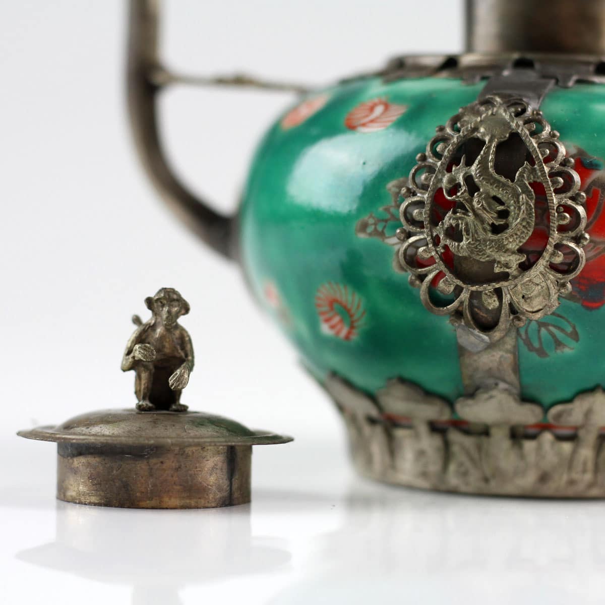 Feines Porzellan und silberfarbene Messingornamente machen dieses Zierkännchen im antiken Stil zu einem besonderen Blickfang. Filigrane Abbilder des Drachen und des Phönix – die kaiserlichen Symbole für die harmonische Vereinigung von Mann und Frau – fassen die handglasierte Keramik ein. Ein wunderschönes Geschenk für jeden Sammler asiatischer Kunstgegenstände.