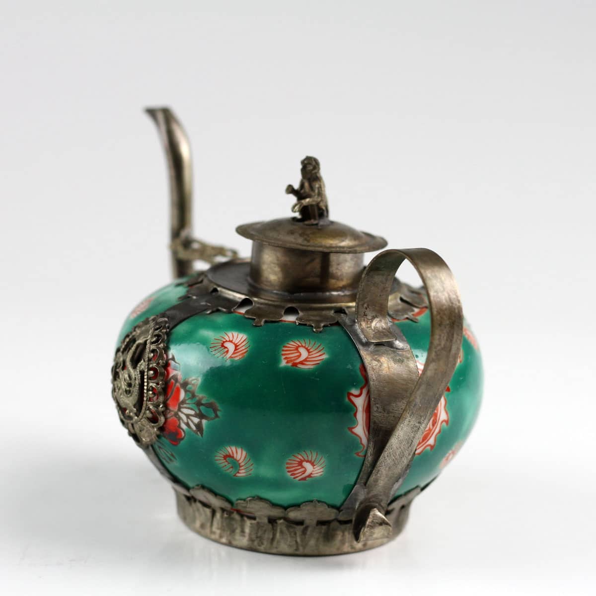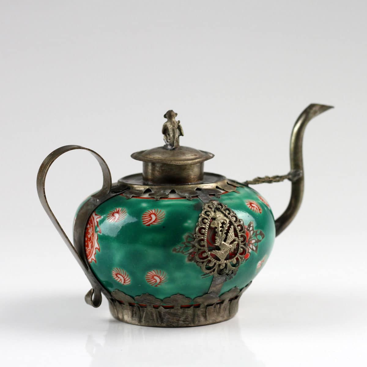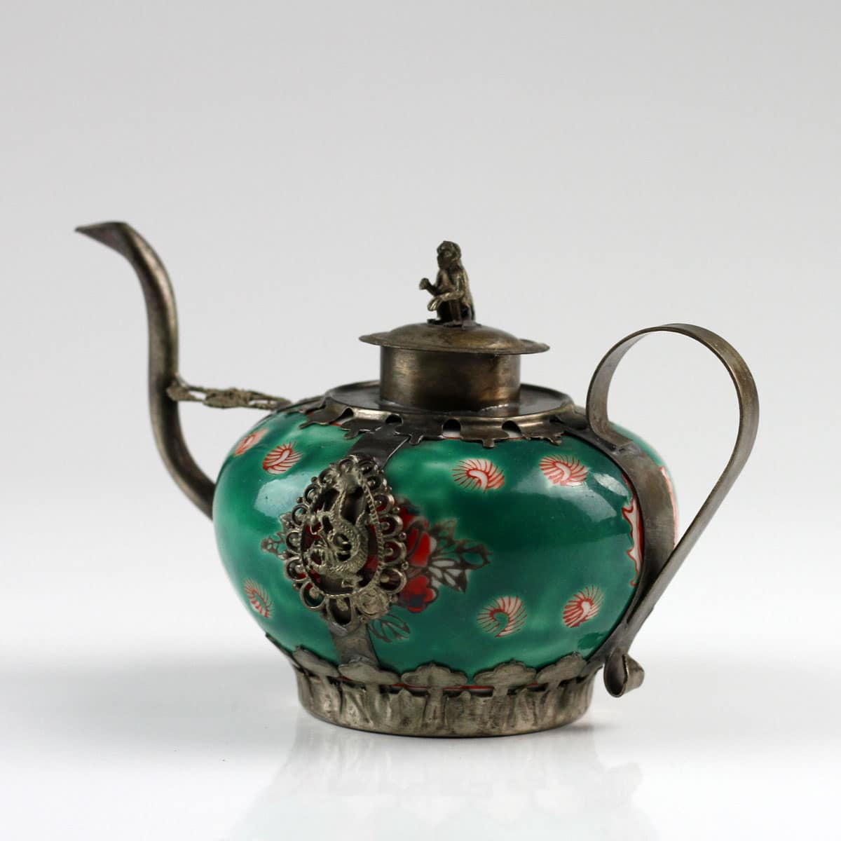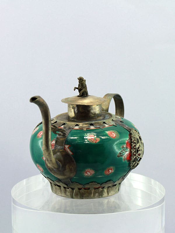 Feines Porzellan und silberfarbene Messingornamente machen dieses Zierkännchen im antiken Stil zu einem besonderen Blickfang. Filigrane Abbilder des Drachen und des Phönix – die kaiserlichen Symbole für die harmonische Vereinigung von Mann und Frau – fassen die handglasierte Keramik ein. Ein wunderschönes Geschenk für jeden Sammler asiatischer Kunstgegenstände.