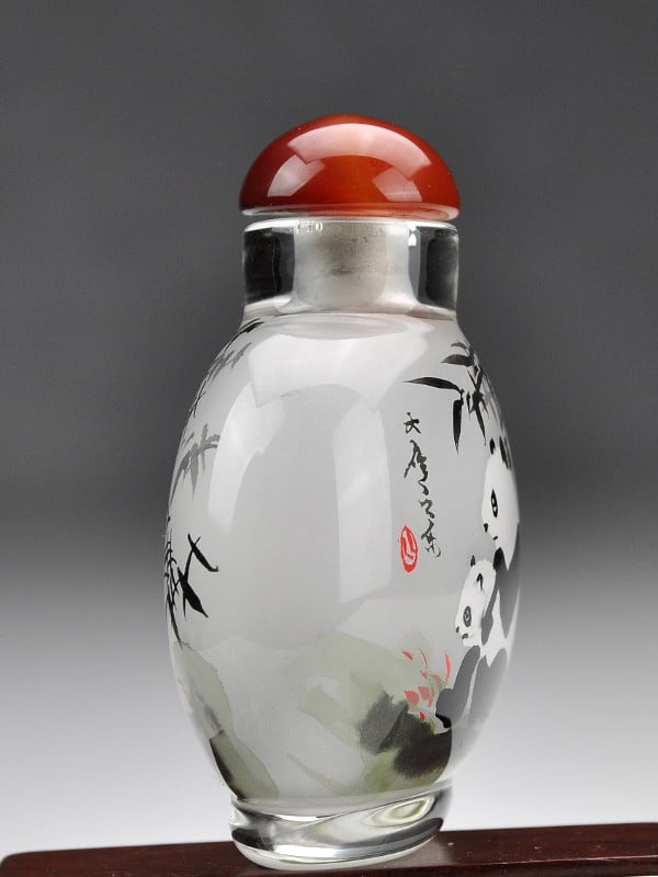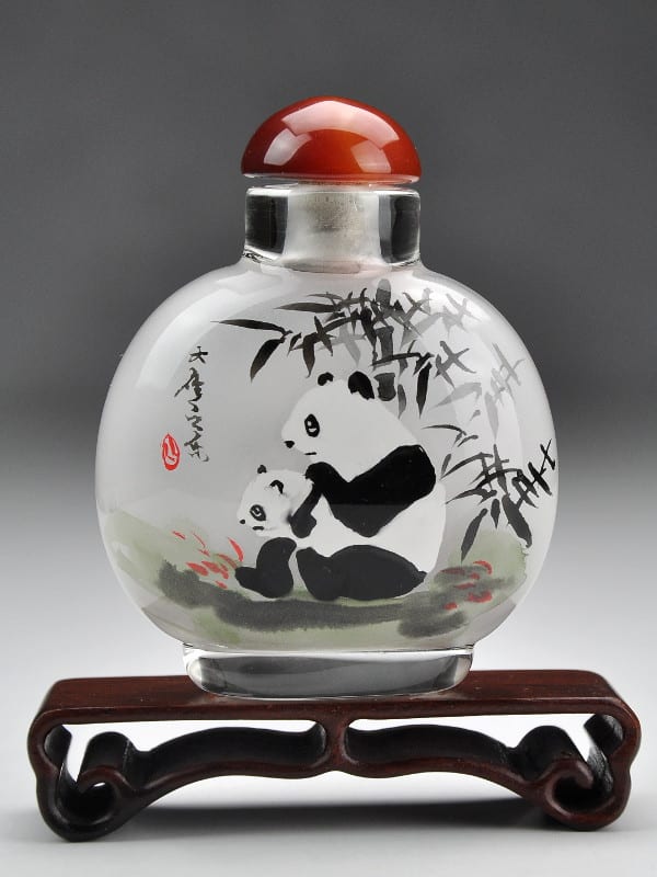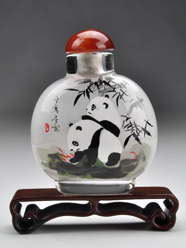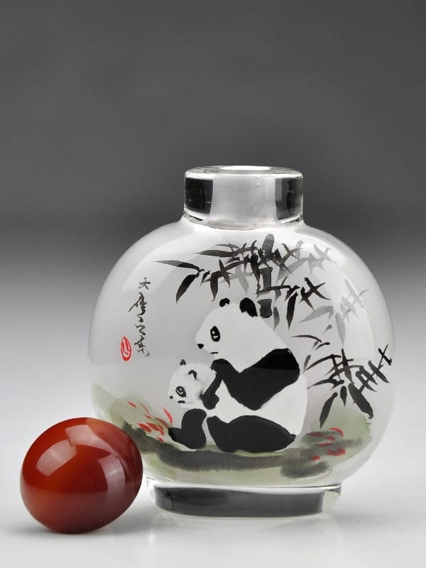 Handbemalte, chinesische Schnupftabakflasche mit dem traditionellen Motiv der Pandas. Pandabären ruhen sich auf einer Lichtung eines Bambuswaldes aus. Der Panda – oder auch „Bambusbär“ genannt – wird in China als Glückstier verehrt. Er symbolisiert vor allem Ausgeglichenheit, Ruhe und Konzentration. Er gilt als Zen-Meister und soll zum Innehalten anregen sowie Traum und Wirklichkeit miteinander verbinden.