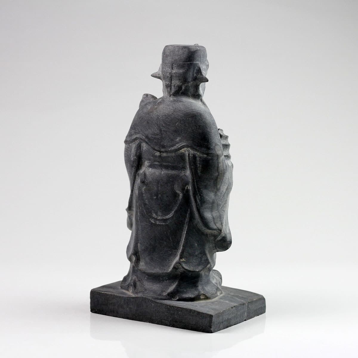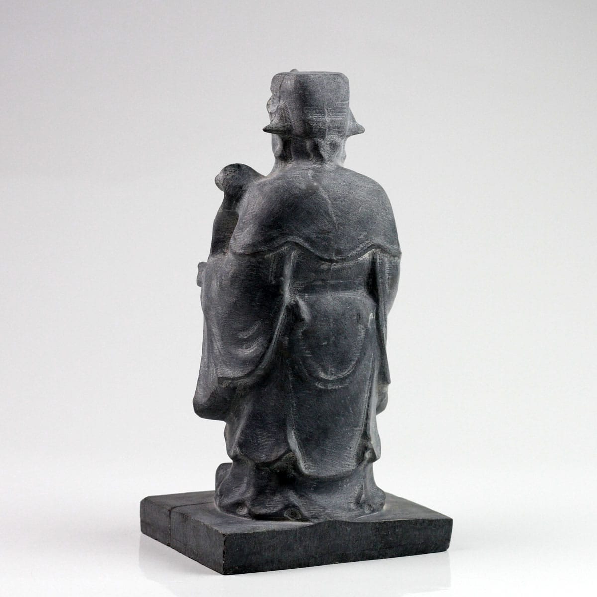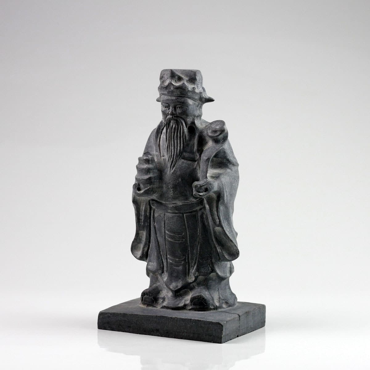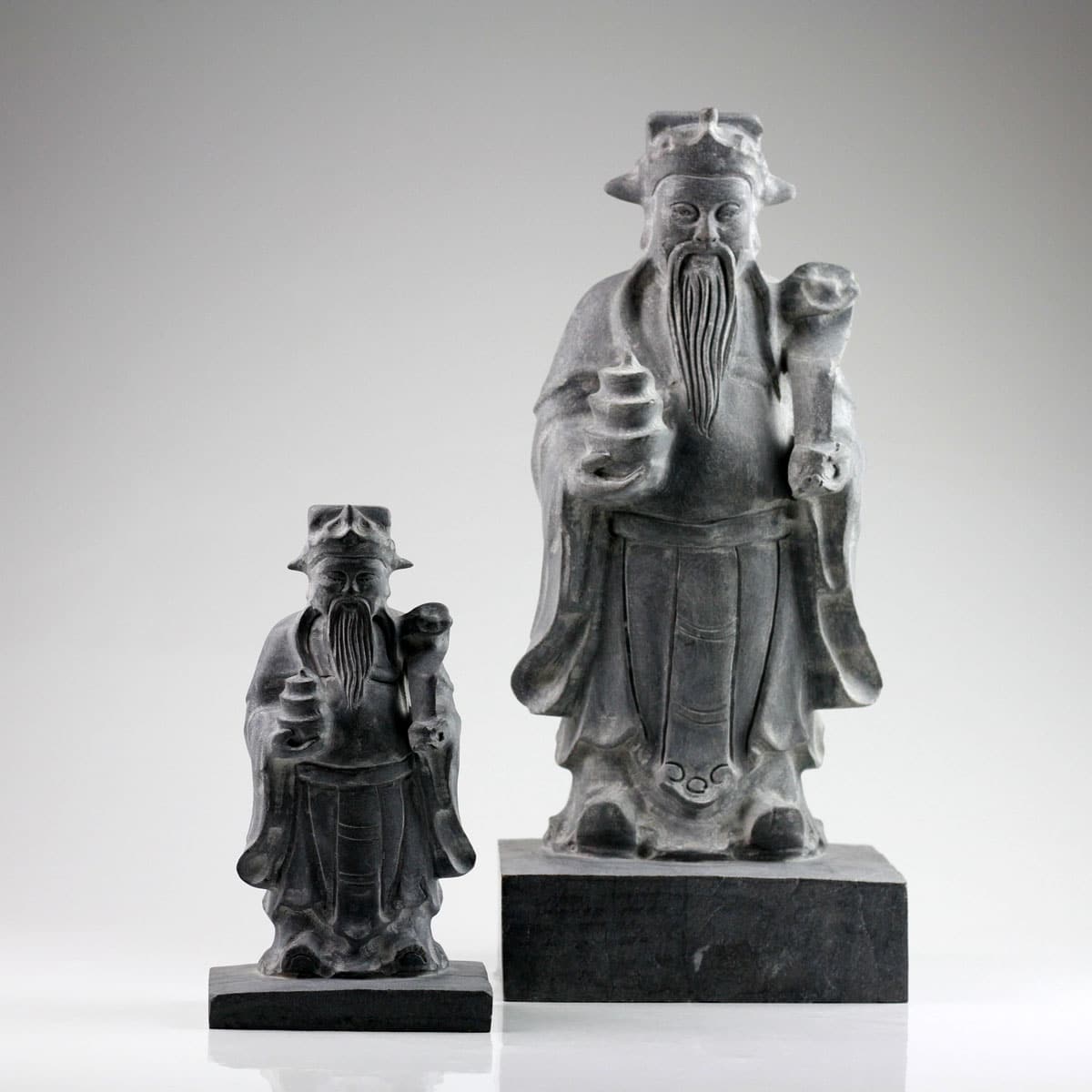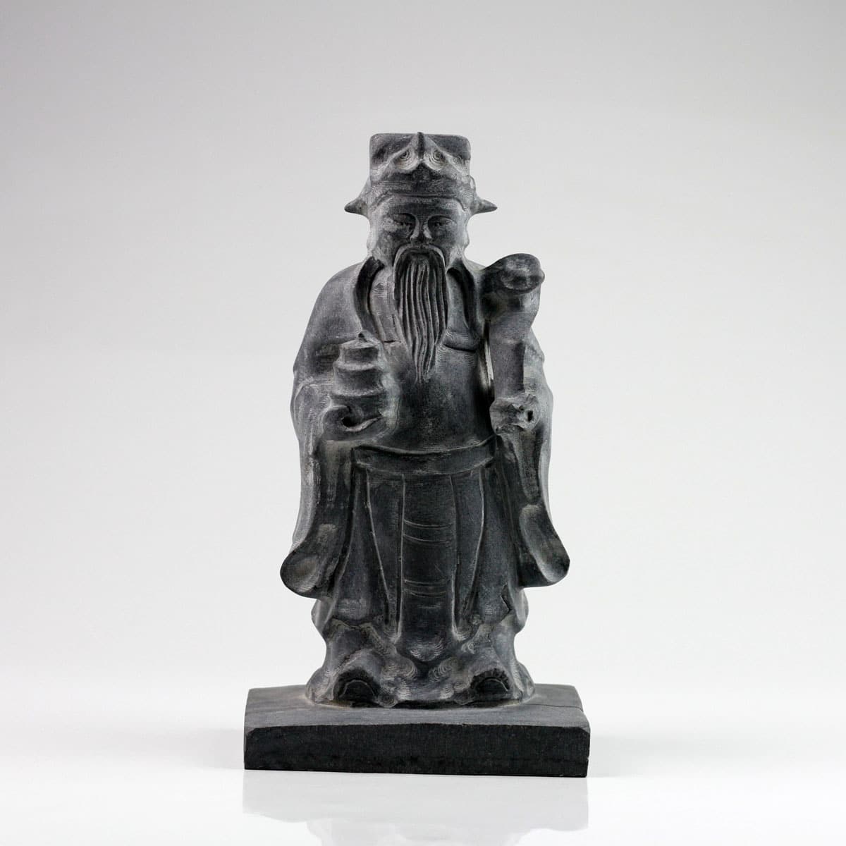 Ruhe ausstrahlende Steinfigur des chinesischen Glücksgottes Lu Xing, dem Gott des Wohlstands und der Fröhlichkeit, dargestellt als Geleehrter auf einem Steinsockel. In seiner linken Hand hält er ein Goldschiffchen, einen Barren, in der rechten das Ruyi-Zepter als stilisierten Lotus, einen traditionellen, chinesischen Talisman.