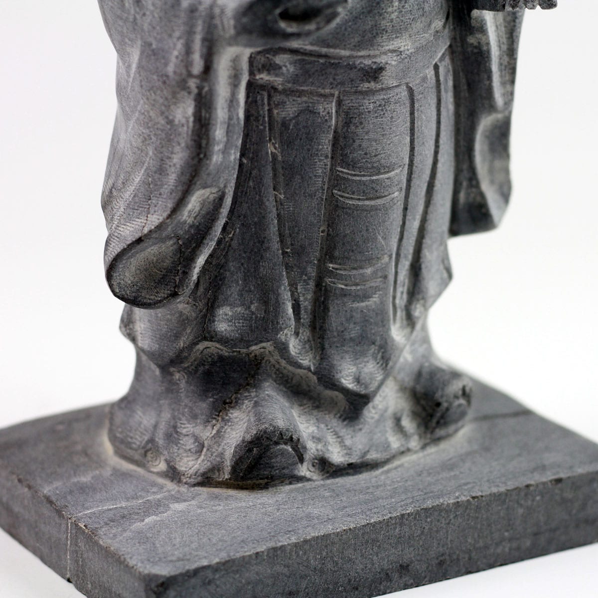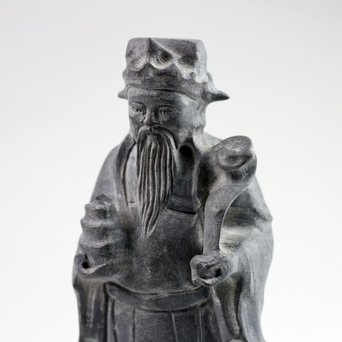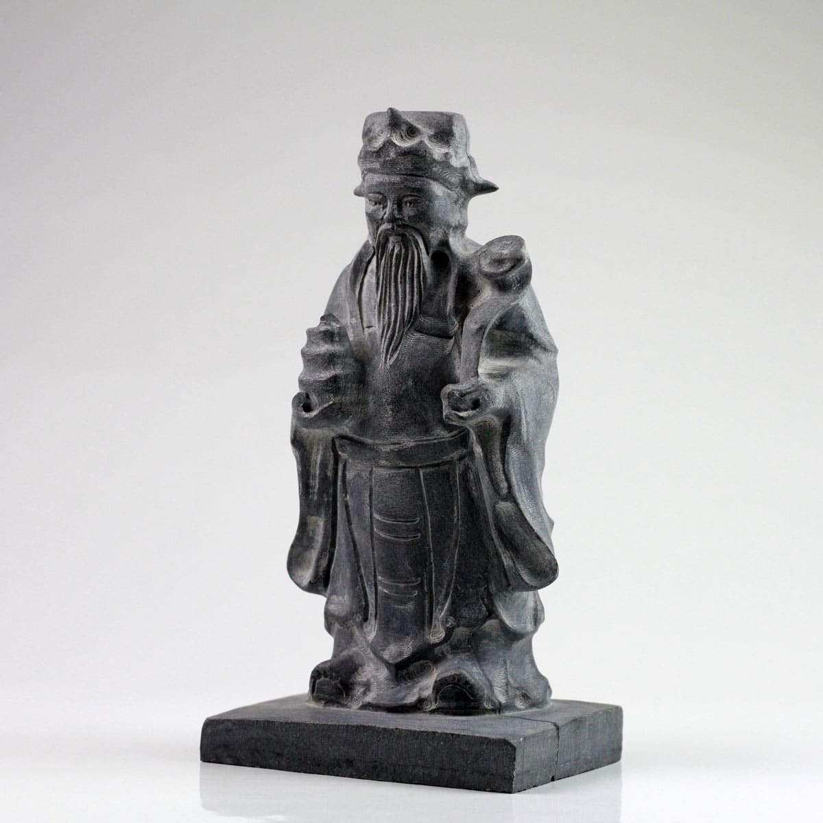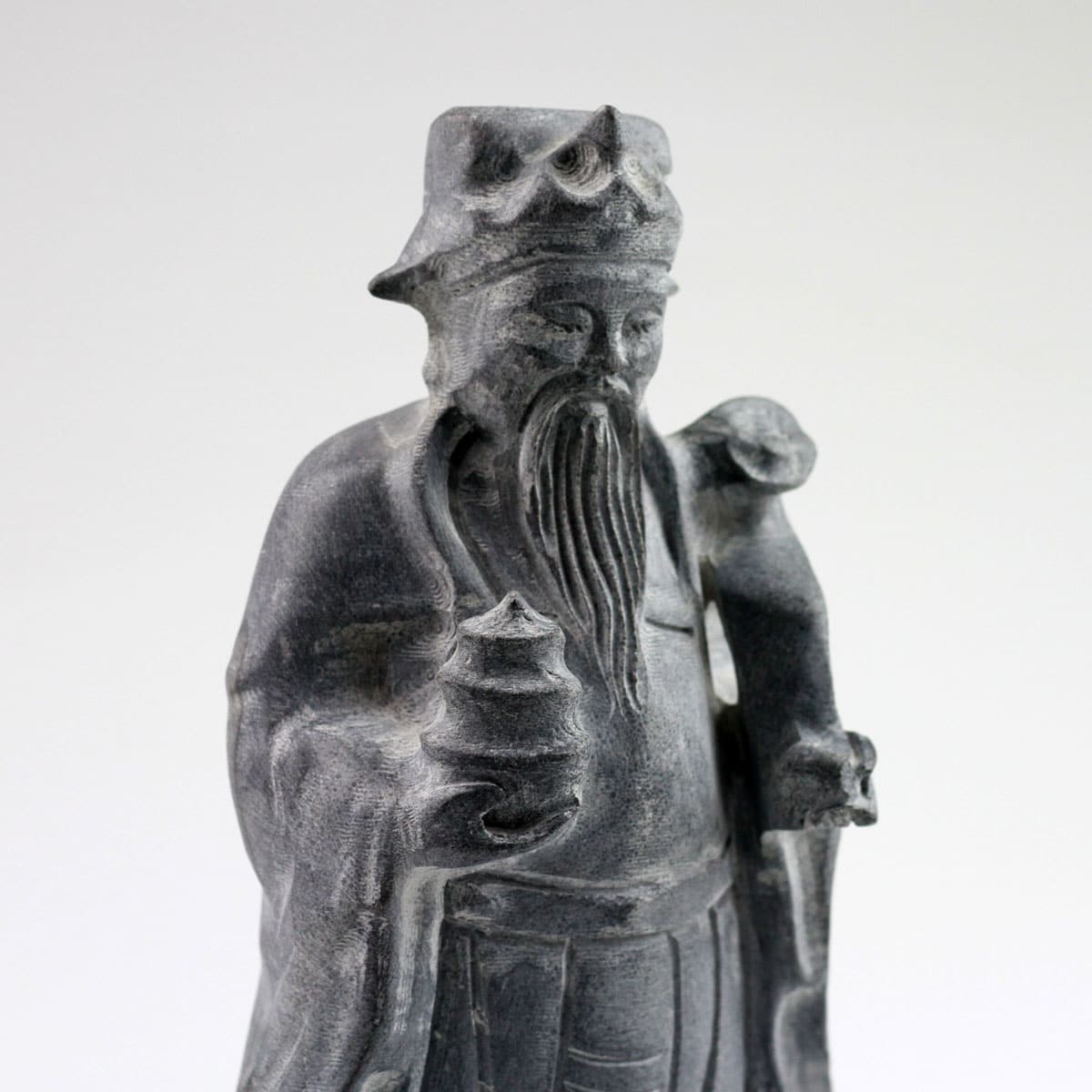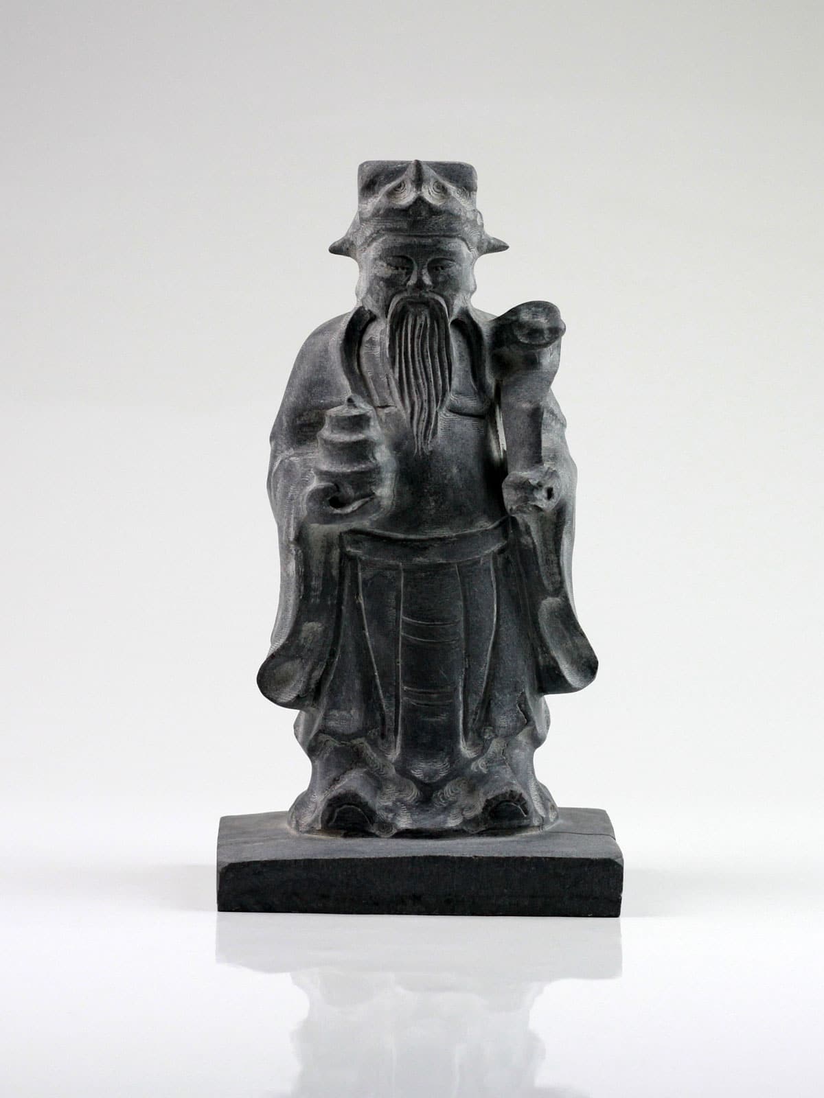 Ruhe ausstrahlende Steinfigur des chinesischen Glücksgottes Lu Xing, dem Gott des Wohlstands und der Fröhlichkeit, dargestellt als Geleehrter auf einem Steinsockel. In seiner linken Hand hält er ein Goldschiffchen, einen Barren, in der rechten das Ruyi-Zepter als stilisierten Lotus, einen traditionellen, chinesischen Talisman.