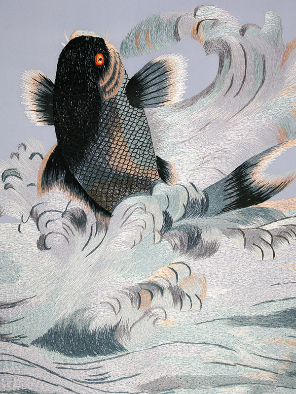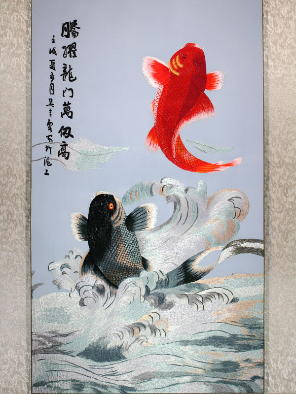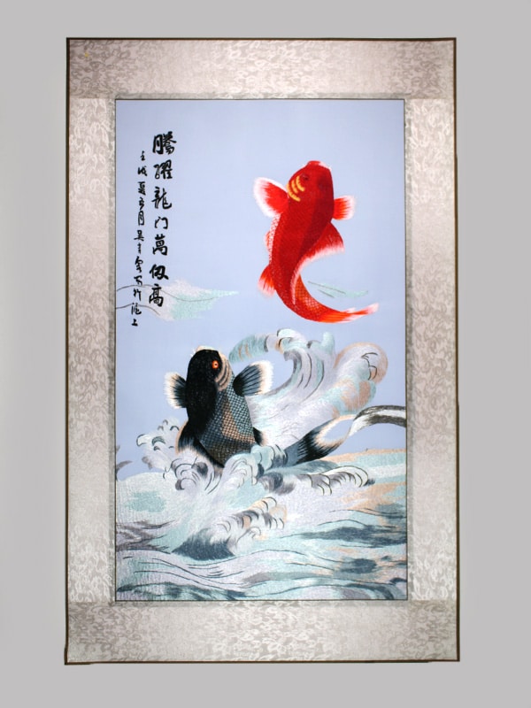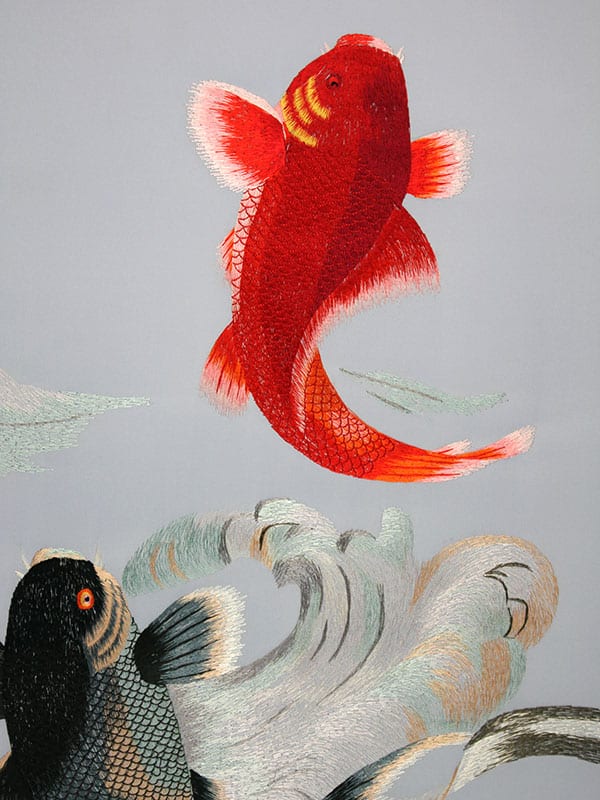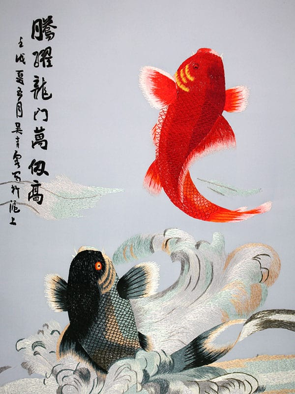 Zwei Koi Karpfen springen aus dem Wasser. Der Koi ist in China aufgrund der Ähnlichkeit der Aussprache des Zeichens für Fisch (鱼 yú) mit der des Zeichens für Wohlstand (裕 yù) und Reichtum ein Glücksbringer. Die aus dem Wasser springenden Fische bedeuten so viel wie „Das Glück springt Dir in die Hände“.