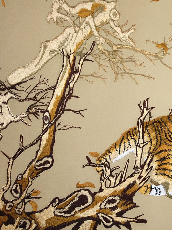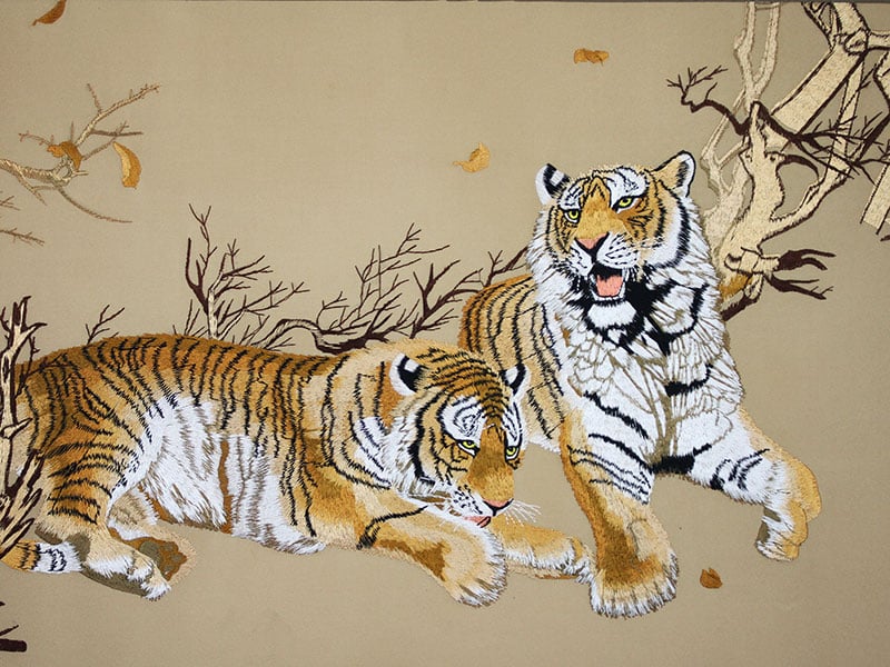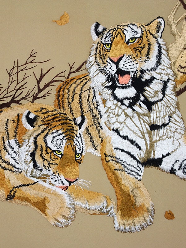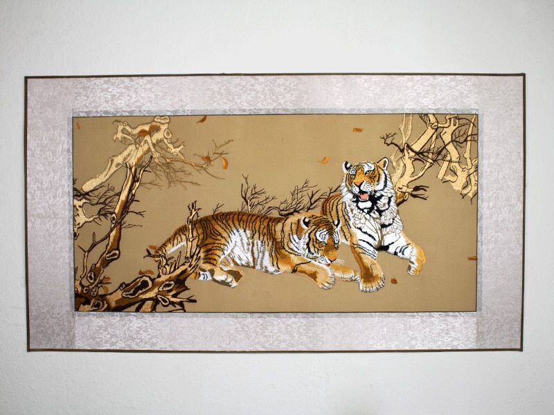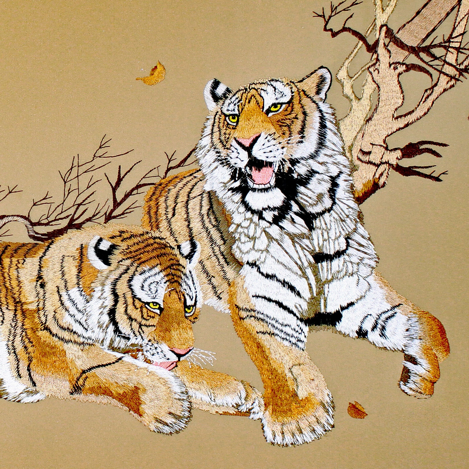 Traditionelle asiatische Wanddekoration als wunderschönes Stickbild mit zwei prächtigen Tiger in warmen Gold- und Beigetönen.