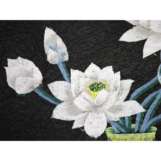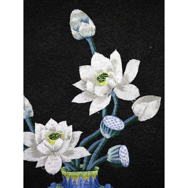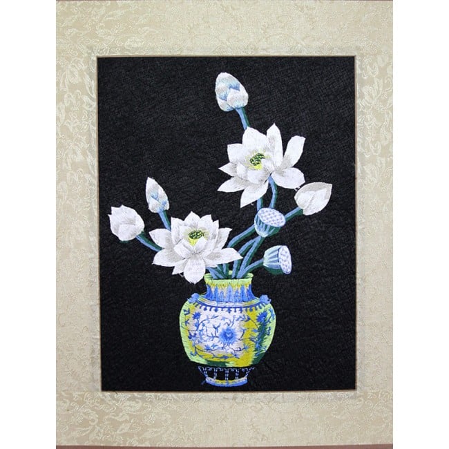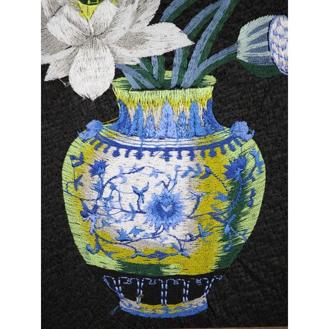 Traditionelles, chinesisches Wandbild aus Stoff, bestickt mit dem klassischem Motiv der weißen Lotusblume in einer Vase. Der Lotus steht in China für Reinheit und Fruchtbarkeit. Diese Symbolik wird durch die klare und präzise Darstellung der Blätter unterstrichen.