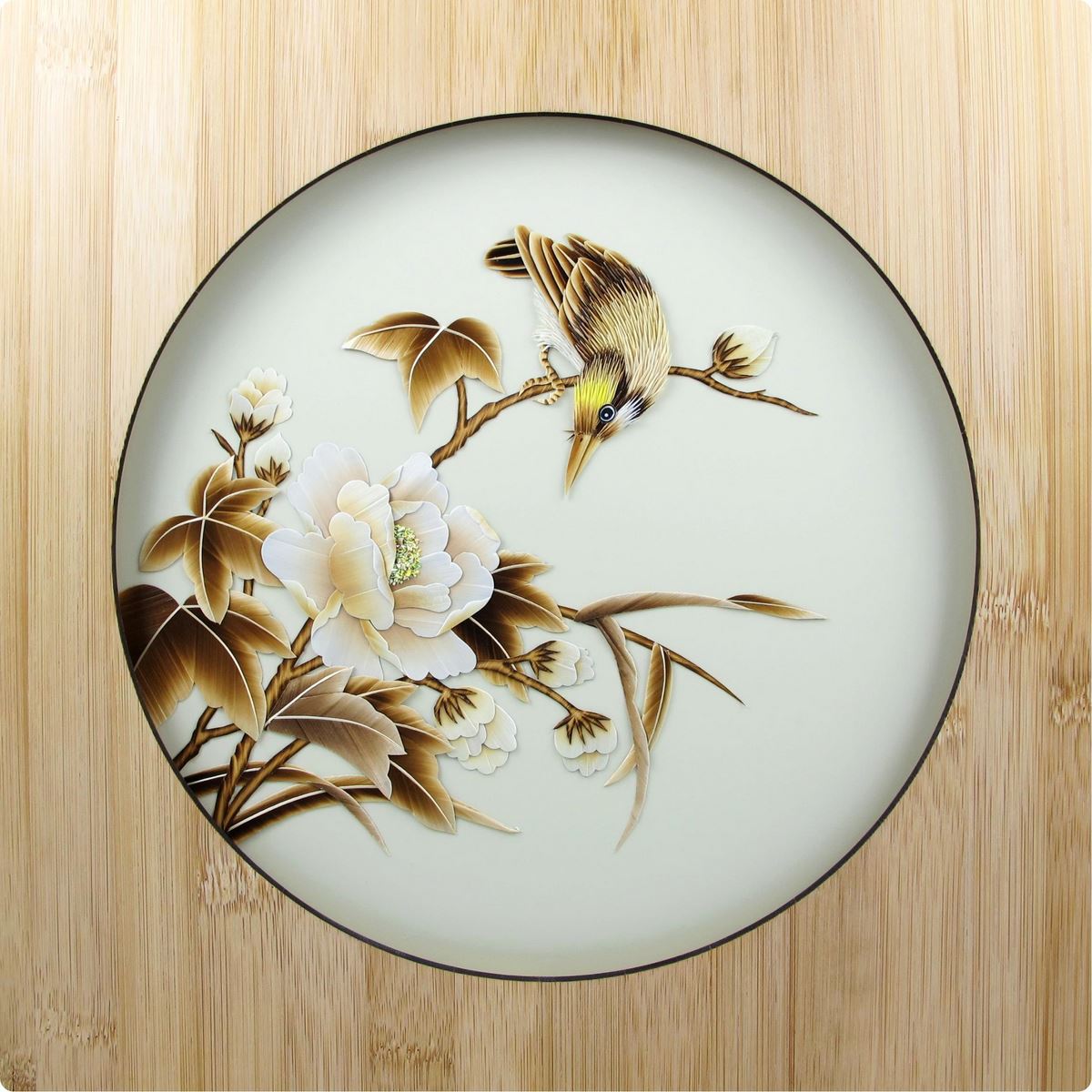 Die filigranen Motive können mit verschiedenen Hintergrundfarben kombiniert werden. Sie haben dadurch freie Farbauswahl und können passend zu Ihrer Einrichtung die für Sie ansprechendste Kombination wählen (bitte unten angeben). Je nach der gewählten Hintergrundfarbe erzielen die Motive im Auge des Betrachters eine ganz unterschiedliche Wirkung; das Spiel der Kontraste schafft in jedem Raum eine einzigartige Atmosphäre. Ein extra in reiner Handarbeit angefertigter, hochwertiger Bambusholzrahmen aus der Region Anji mit eingesetztem Glas zum Schutz der Naturbilder rundet diese einzigartigen Kunstwerke ab.