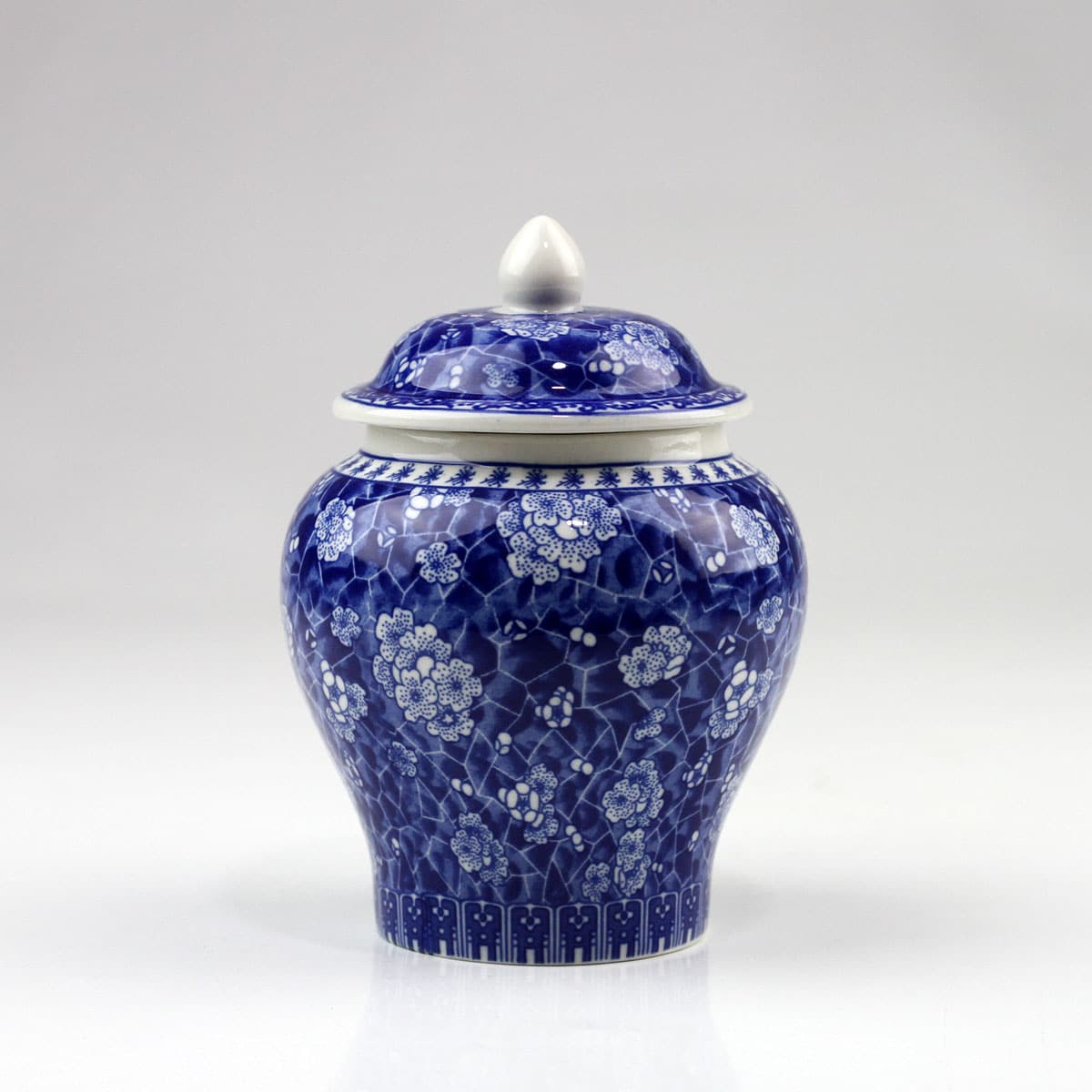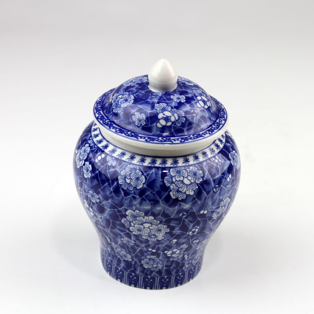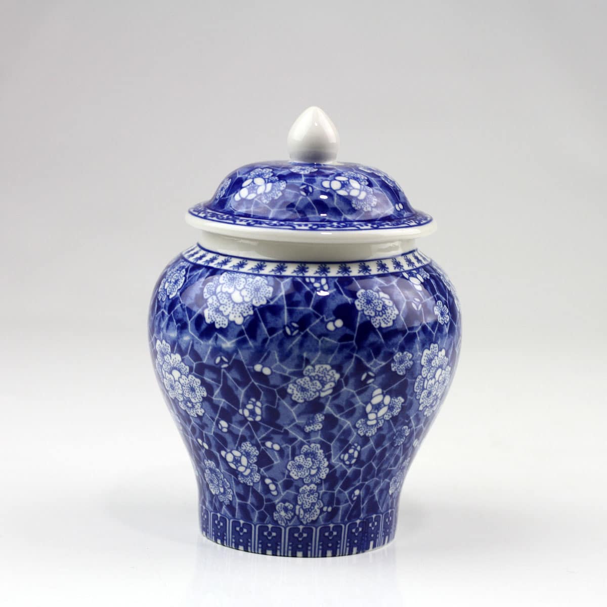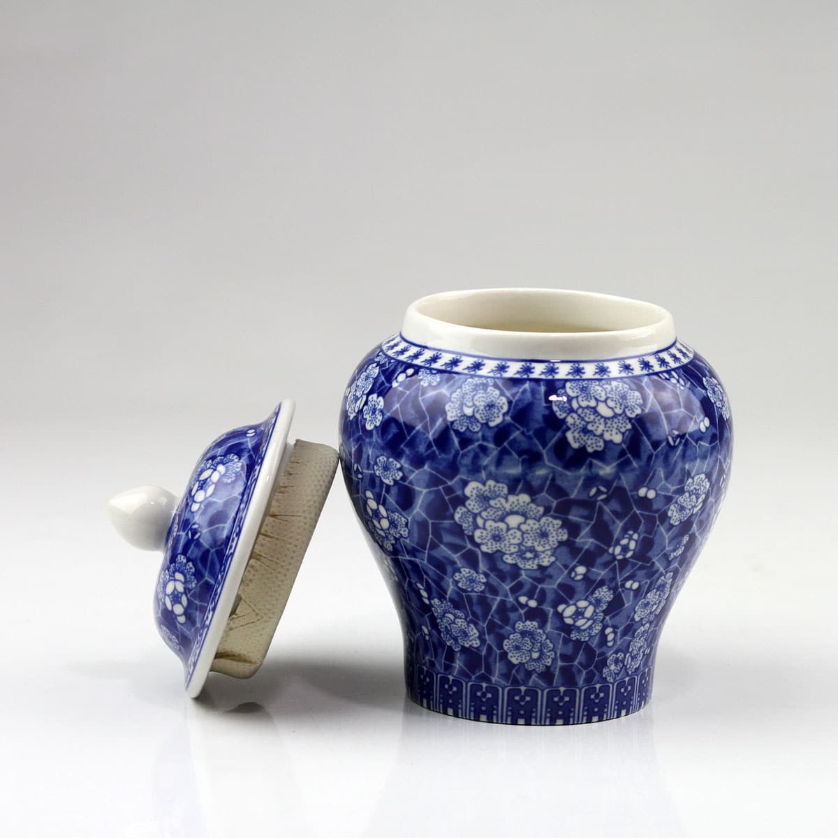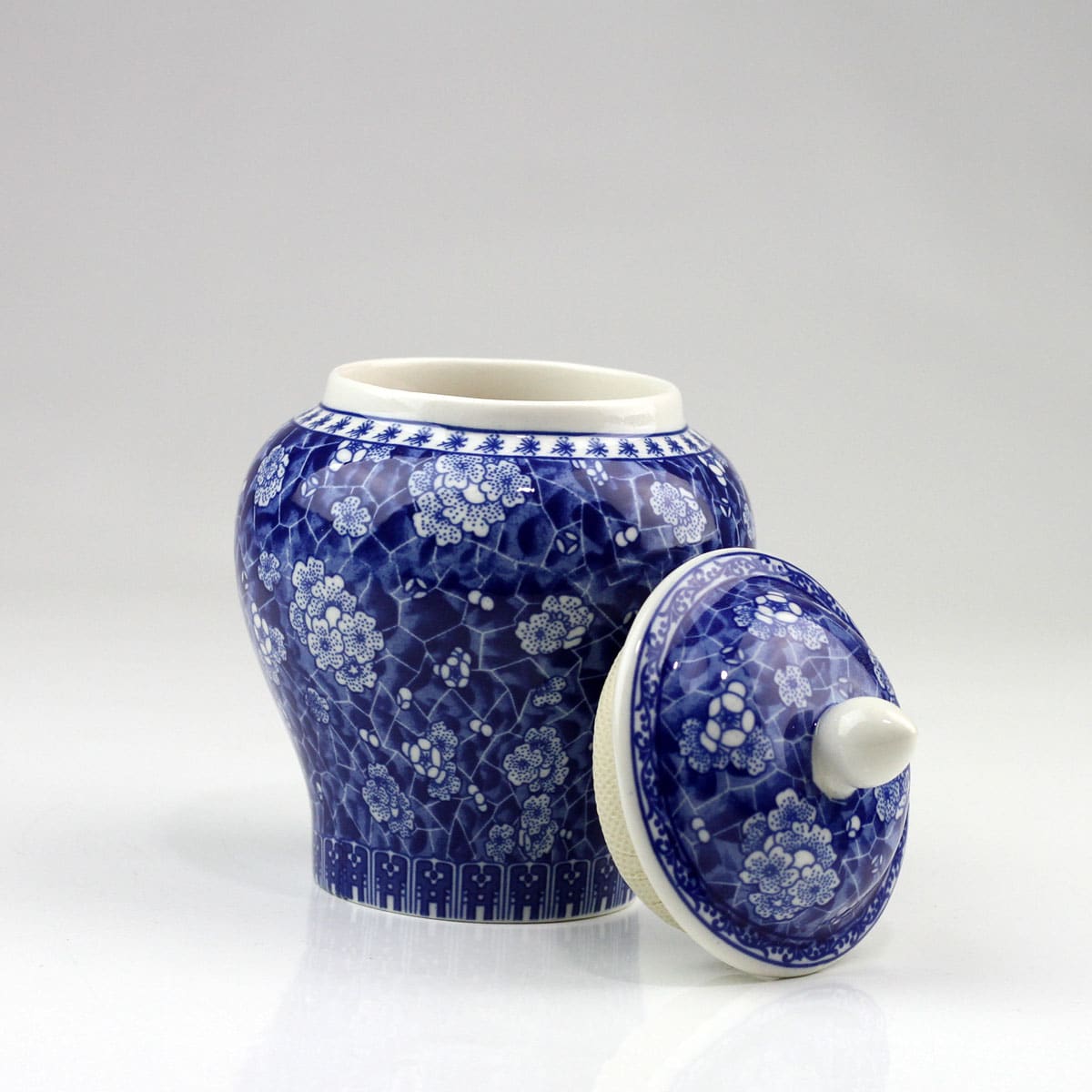 Formschöne, klassische und handgearbeitete Porzellan-Teedose / Teeurne mit Aromaschutzdeckel. Prächtige Kirschblüten und Ornamente auf blau bemaltem Hintergrund zieren diese stilvolle Teedose.
