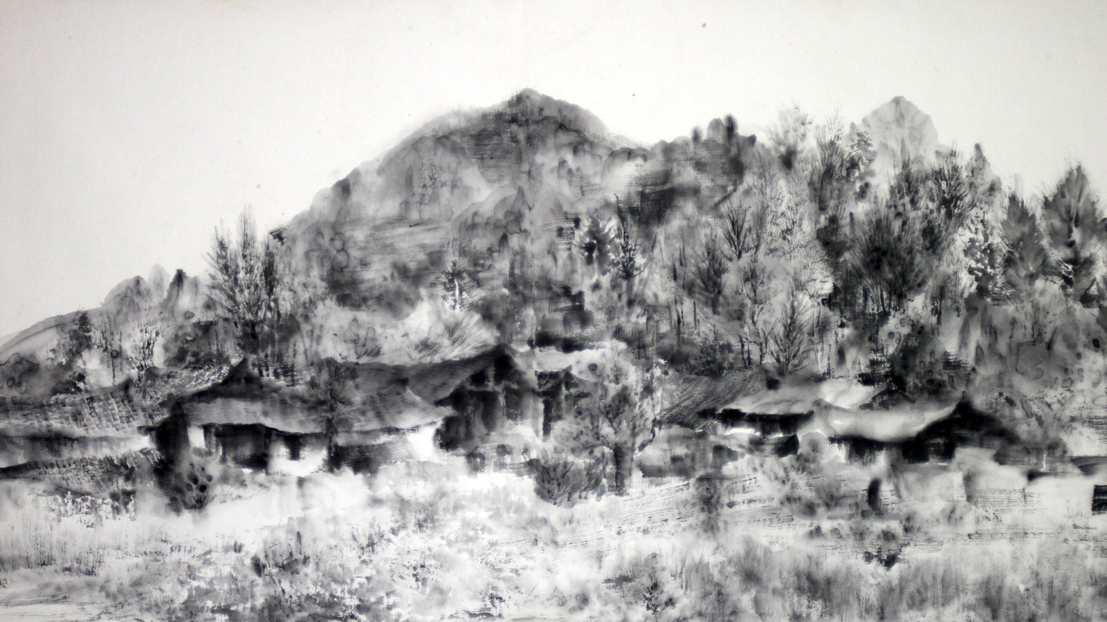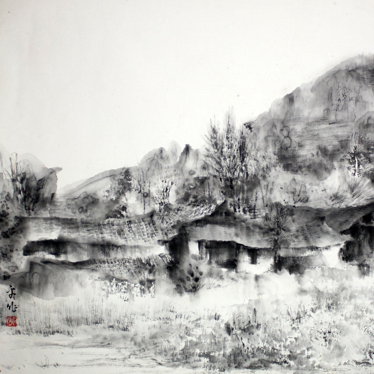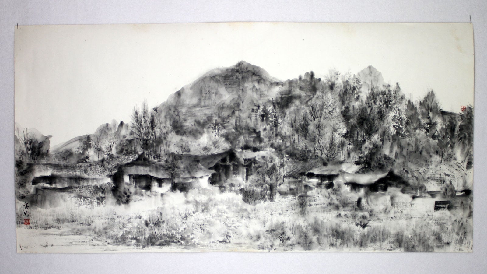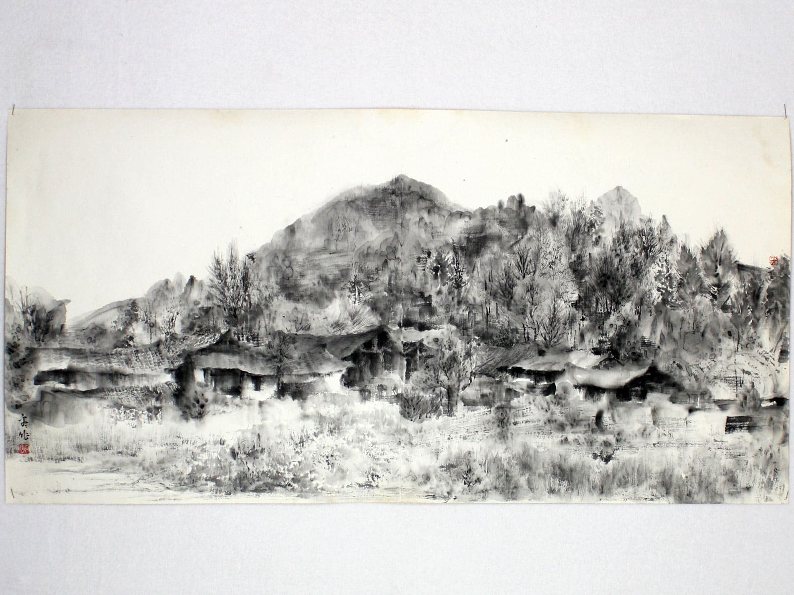 Chinesische Tuschemalerei schwarz-weiß eines asiatischen Dorfes am Fuße des Berges als Originalbild der Künstlerin An Ping Ping.