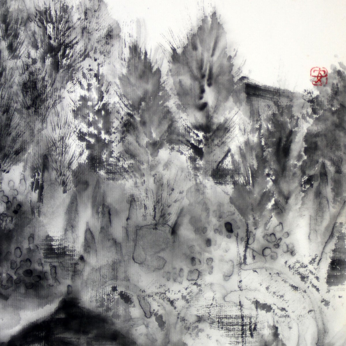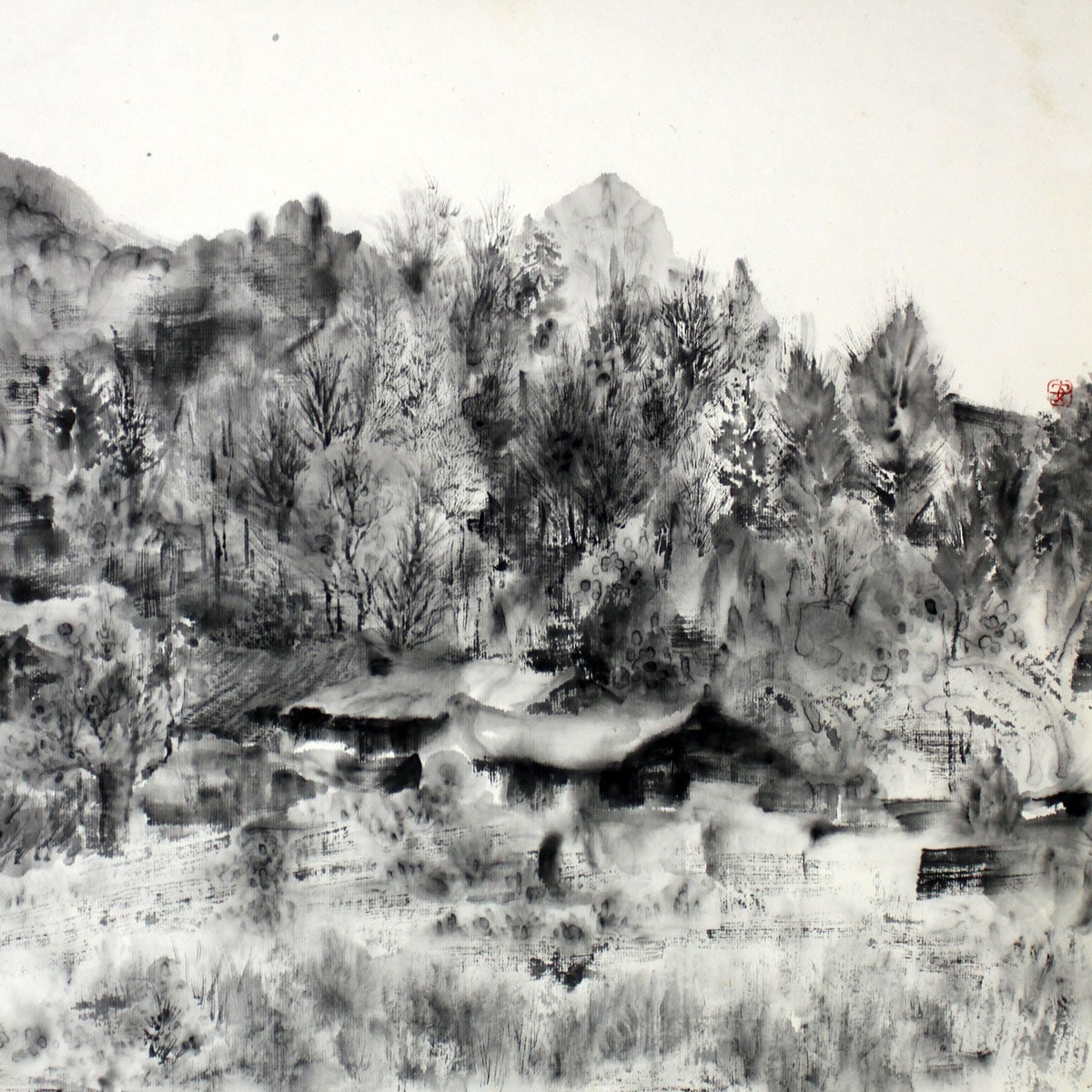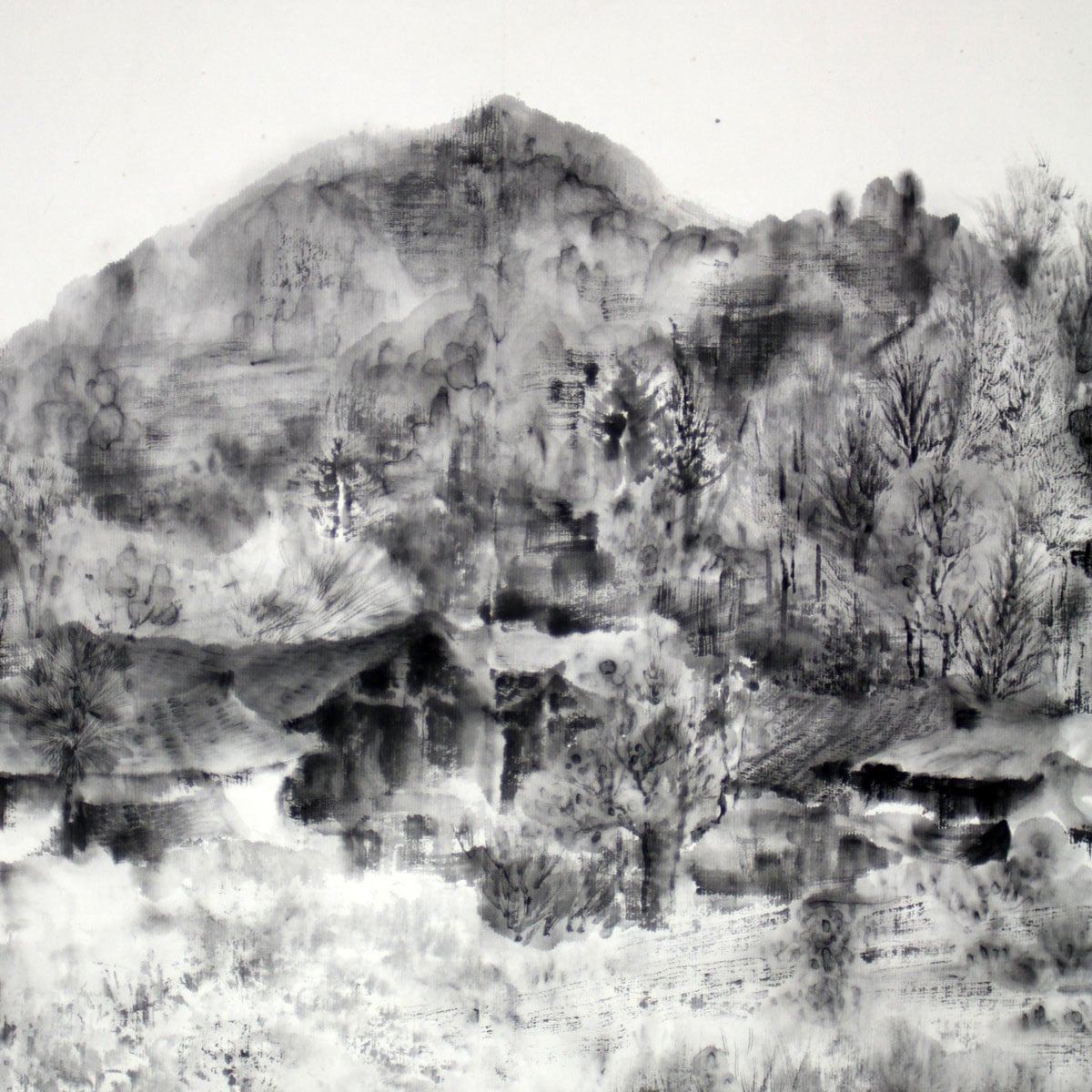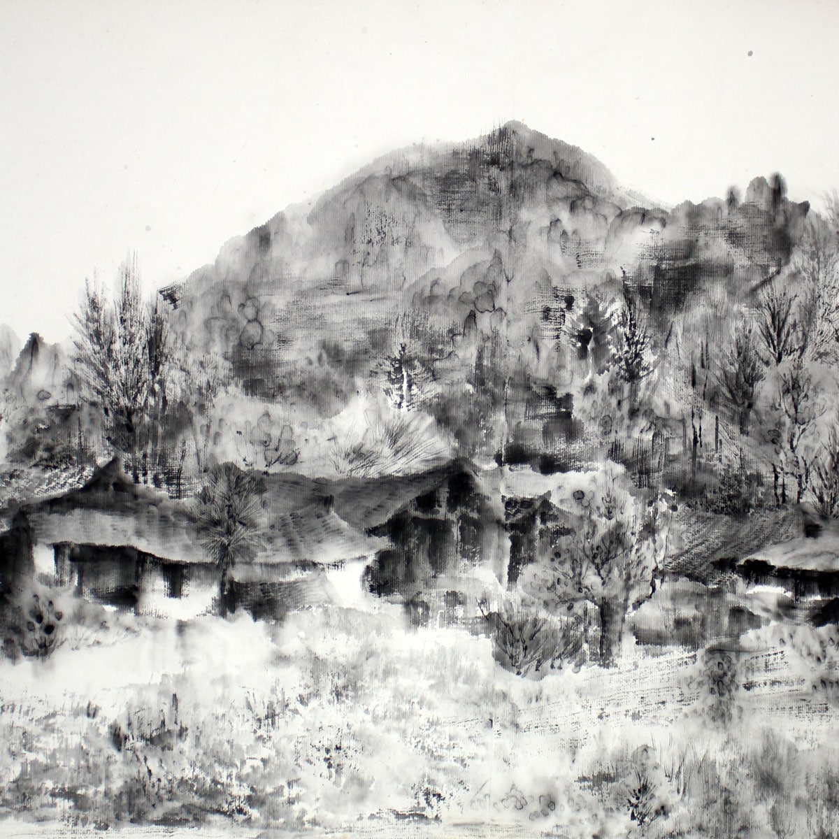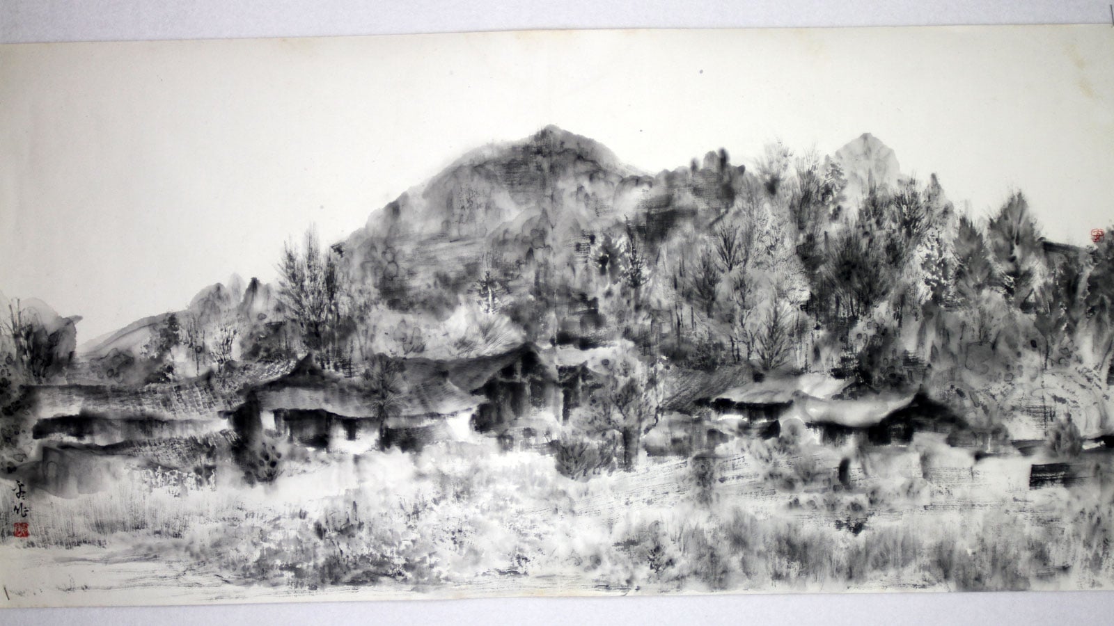 Chinesische Tuschemalerei schwarz-weiß eines asiatischen Dorfes am Fuße des Berges als Originalbild der Künstlerin An Ping Ping.