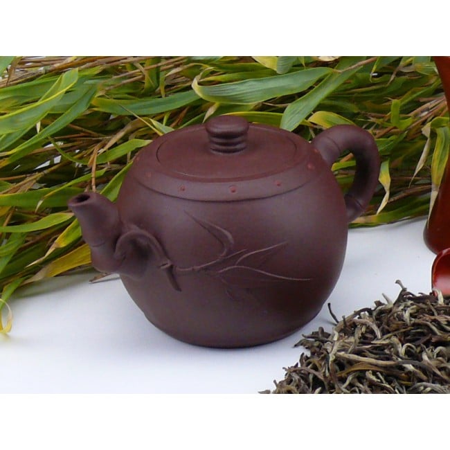 Eine ansprechende, handgearbeitete Kanne in Pao Zhun Form. Die dezenten Verzierungen erinnern an ein edles Gefäß, an dem ein Bambuszweig emporwächst.
